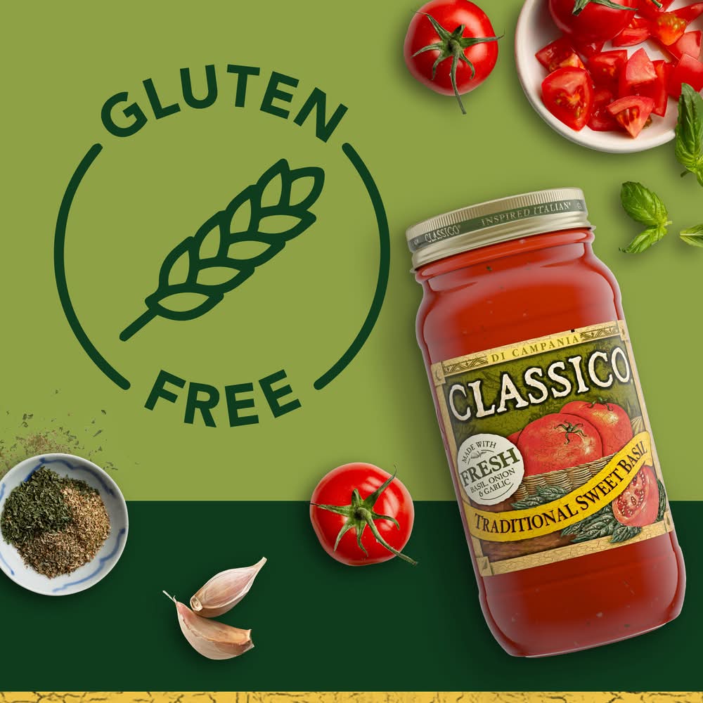 Simple and sweet. Build your next homemade dish with Classico Traditional Sweet Basil Pasta Sauce, a delicious staple that's perfectly accented with aromatic basil. Classico Traditional Sweet Basil Pasta Sauce is filled with real ingredients that help you create a homemade dish that's authentically delicious. Our sauce is easy to prepare and offers a rich, flavorful taste. Made with real ingredients, our sauce combines tomatoes with basil for a hearty flavor. Simply simmer and serve our sauce with your favorite meal. Use our red sauce for spaghetti, chicken Parmesan, lasagna or grilled chicken pasta. You can even try our sauce as a pizza sauce for homemade pizza or a dipping sauce for garlic bread. Be sure to refrigerate our 24-ounce jar of sauce after opening. Classico pasta sauce has a flavor for everyone in your family, from Traditional Sweet Basil Pasta Sauce to Roasted Garlic Pasta Sauce. Make it yours, for your homemade dish. • Flavor: Sweet basil • Kraft Foods, PO Box 57, Pittsburgh, PA