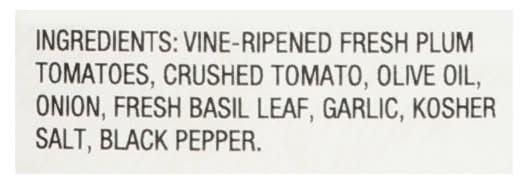 Ingredients: Vine-Ripened Fresh Plum Tomatoes, Crushed Tomato, Olive Oil, Onion, Fresh Basil Leaf, Garlic, Kosher Salt, Black Pepper