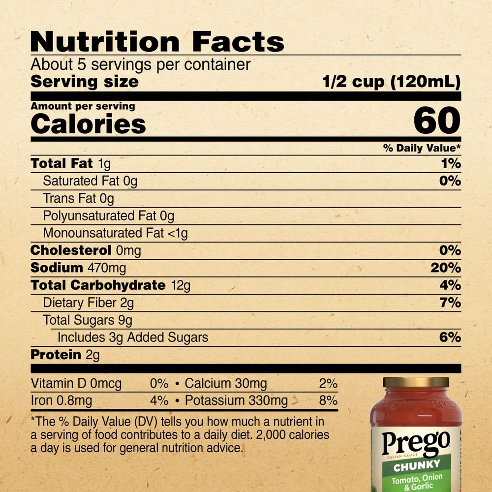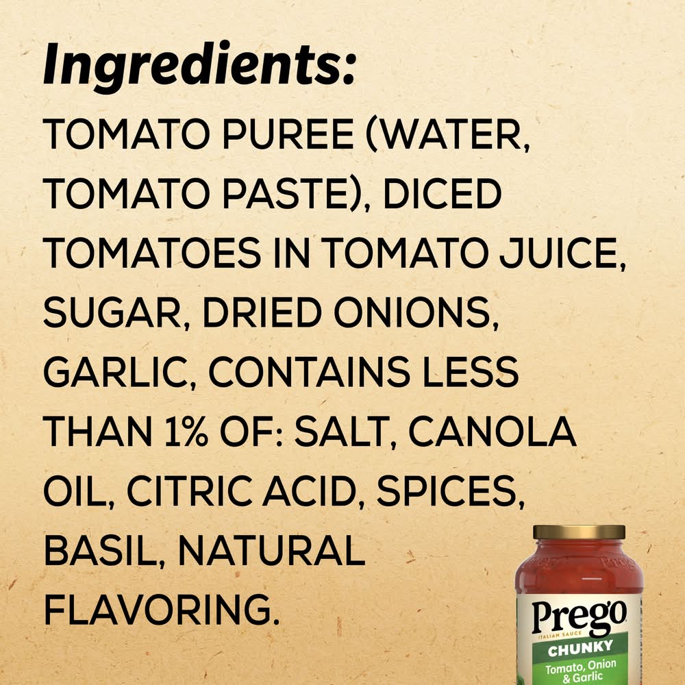 Be the hero at dinner with Prego Chunky Tomato with Garlic and Onion Pasta Sauce. Versatile and delicious, this classic red sauce features the bold flavors of tomatoes, a touch of roasted garlic and sweet onions. This pasta sauce has a taste everyone loves and a thick texture that doesn’t water out, making it a perfect pairing with any pasta. This Prego pasta sauce is gluten free and vegetarian for a spaghetti sauce you can feel good about. Top off any pasta with Prego sauce for a quick, family-pleasing meal, or use it as a base for your favorite recipes. The tomato sauce jar top is easy to close and store in the refrigerator for leftovers. Give your family the taste everyone loves with Prego. • Flavor: Chunky tomato-garlic-onion • Campbell Soup Company, Camden, NJ.