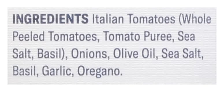 Ingredients: Italian Tomatoes (Whole Peeled Tomatoes, Tomato Puree, Sea Salt, Basil), Onions, Olive Oil, Sea Salt, Basil, Garlic, Oregano
