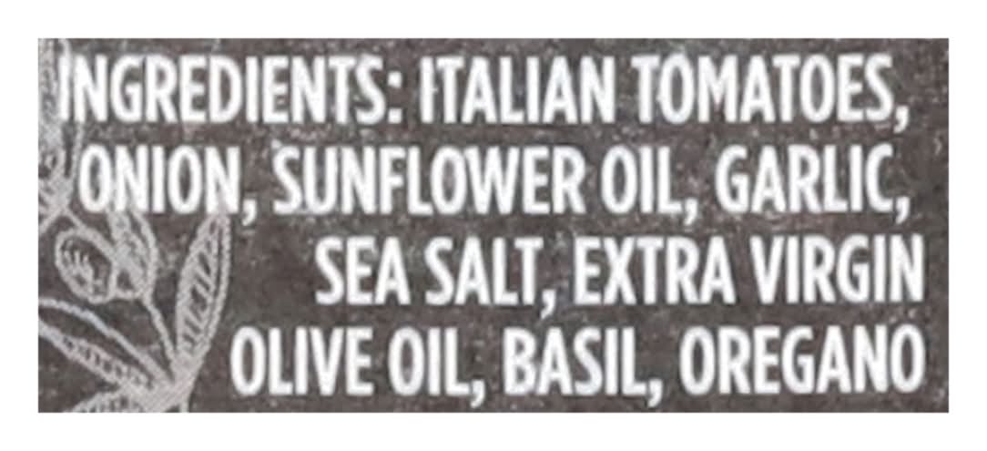 Ingredients: Italian Tomatoes, Onion, Sunflower Oil, Garlic, Sea Salt, Extra Virgin Olive Oil, Basil, Oregano