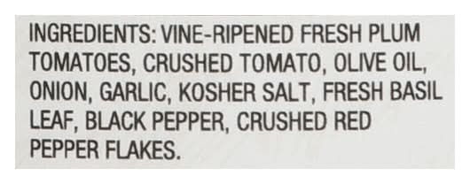 Ingredients: Vine-Ripened Fresh Plum Tomatoes, Crushed Tomato, Olive Oil, Onion, Garlic, Kosher Salt, Fresh Basil, Leaf, Black Pepper, Crushed Red Pepper Flakes