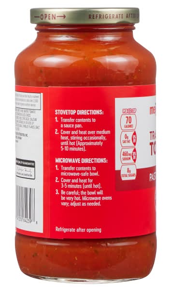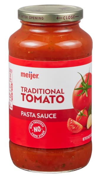 Meijer Traditional Tomato Sauce is seasoned with onion, garlic, and parsley, offering a taste reminiscent of homemade sauce. It features a thick texture, making it ideal for mixing with cooked pasta and suitable for crafting an Italian-style dinner.