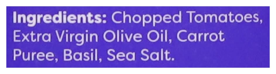 Ingredients: Chopped Tomatoes, Extra Virgin Olive Oil, Carrot Puree, Basil, Sea Salt