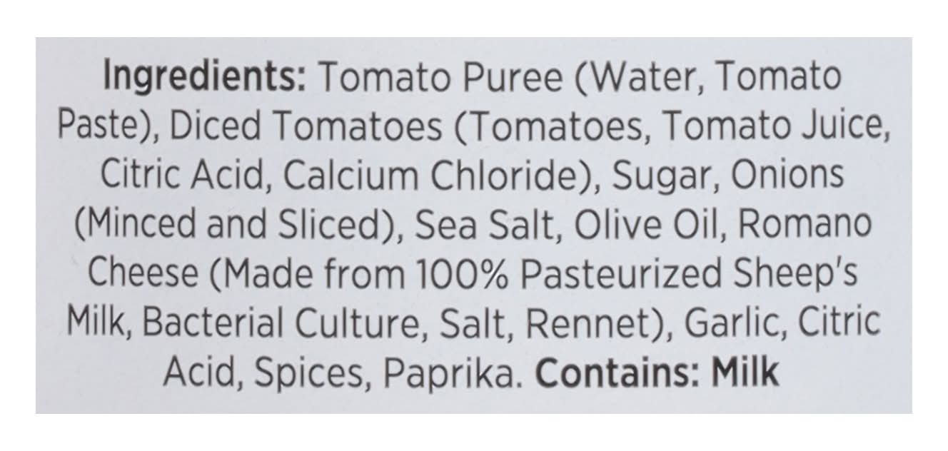 Ingredients: Tomato Puree (Water, Tomato Paste), Diced Tomatoes (Tomatoes, Tomato Juice, Citric Acid, Calcium Chloride), Sugar, Onions (Minced and Sliced), Sea Salt, Olive Oil, Romano Cheese (Made from 100% Pasteurized Sheep's Milk, Bacterial Culture, Salt, Rennet), Garlic, Citric Acid, Spices, Paprika Contains: Milk