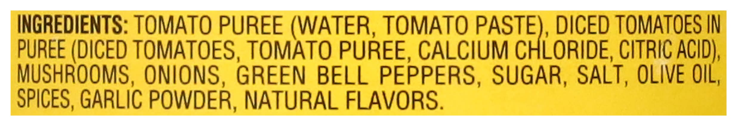 Ingredients: Tomato Puree (Water, Tomato Paste), Diced Tomatoes in Puree (Diced Tomatoes, Tomato Puree, Calcium Chloride, Citric Acid), Mushrooms, Onions, Green Bell Peppers, Sugar, Soybean Oil, Salt, Spices, Garlic Powder, Natural Flavors Contains: Soybeans