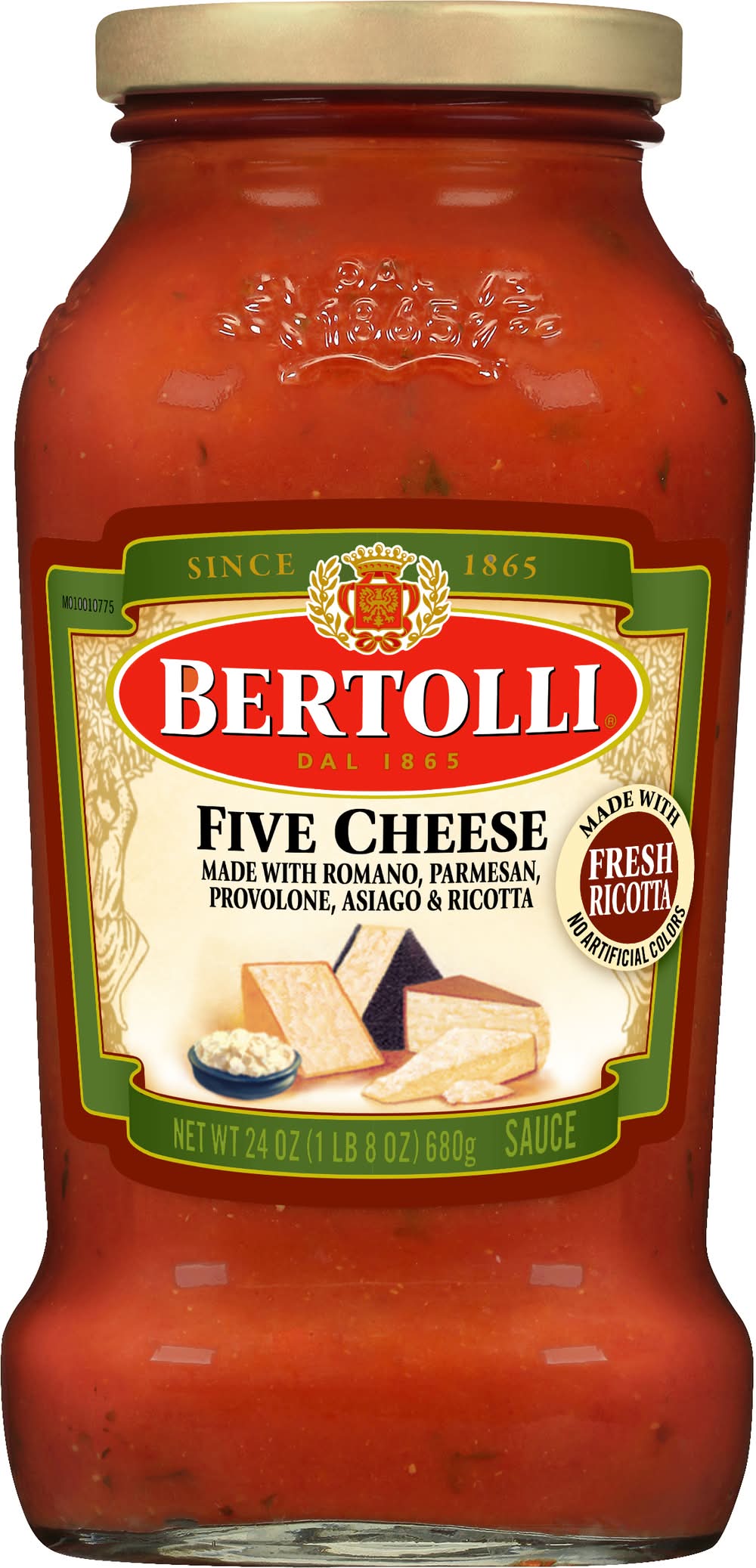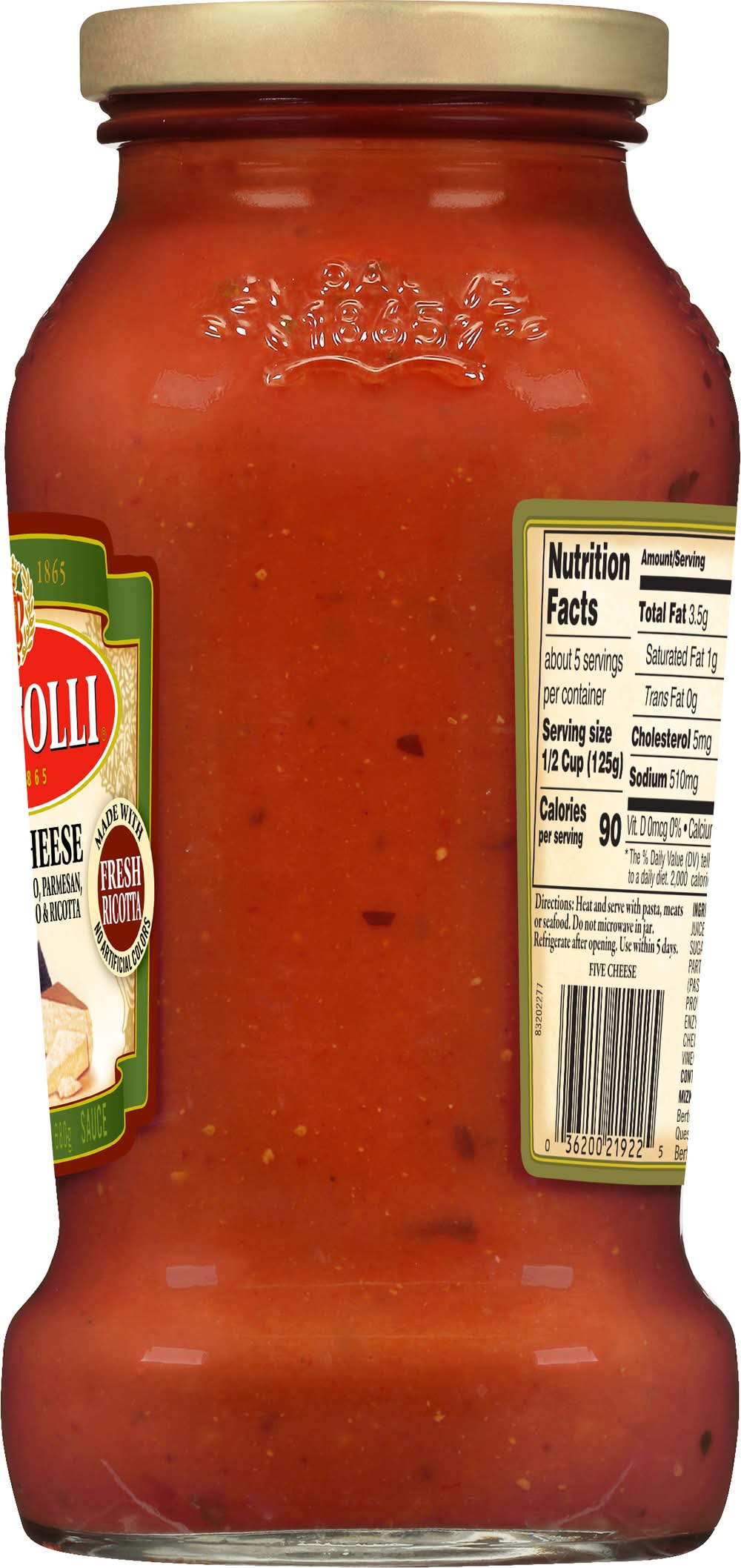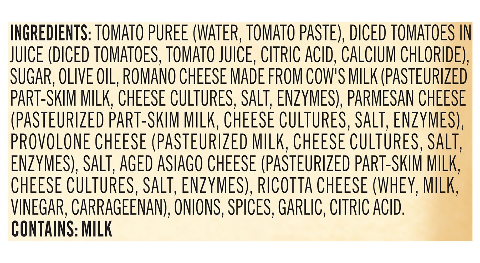 Ingredients: Water, Tomato Paste, Diced Tomatoes, Tomato Juice, Calcium Chloride, Citric Acid, Sugar, Olive Oil, Romano Cheese Made From Cow's Milk, Parmesan Cheese, Provolone Cheese, Salt, Aged Asiago Cheese, Ricotta Cheese, Onions, Basil, Garlic, Spices Contains: Milk