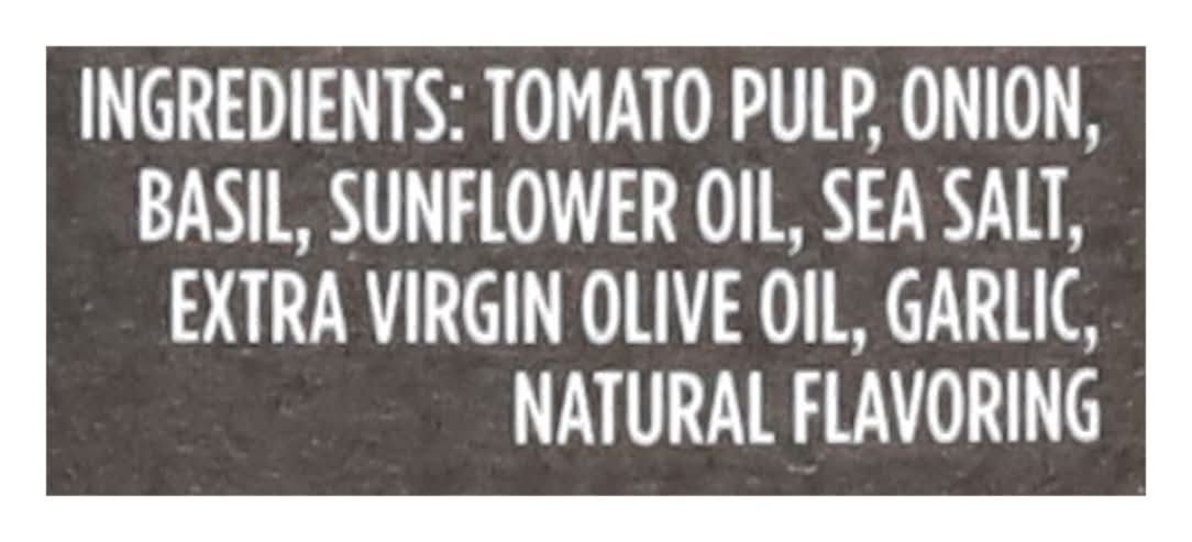 Ingredients: Tomato Pulp, Onion, Basil, Sunflower Oil, Sea Salt, Extra Virgin Olive Oil, Garlic, Natural Flavoring