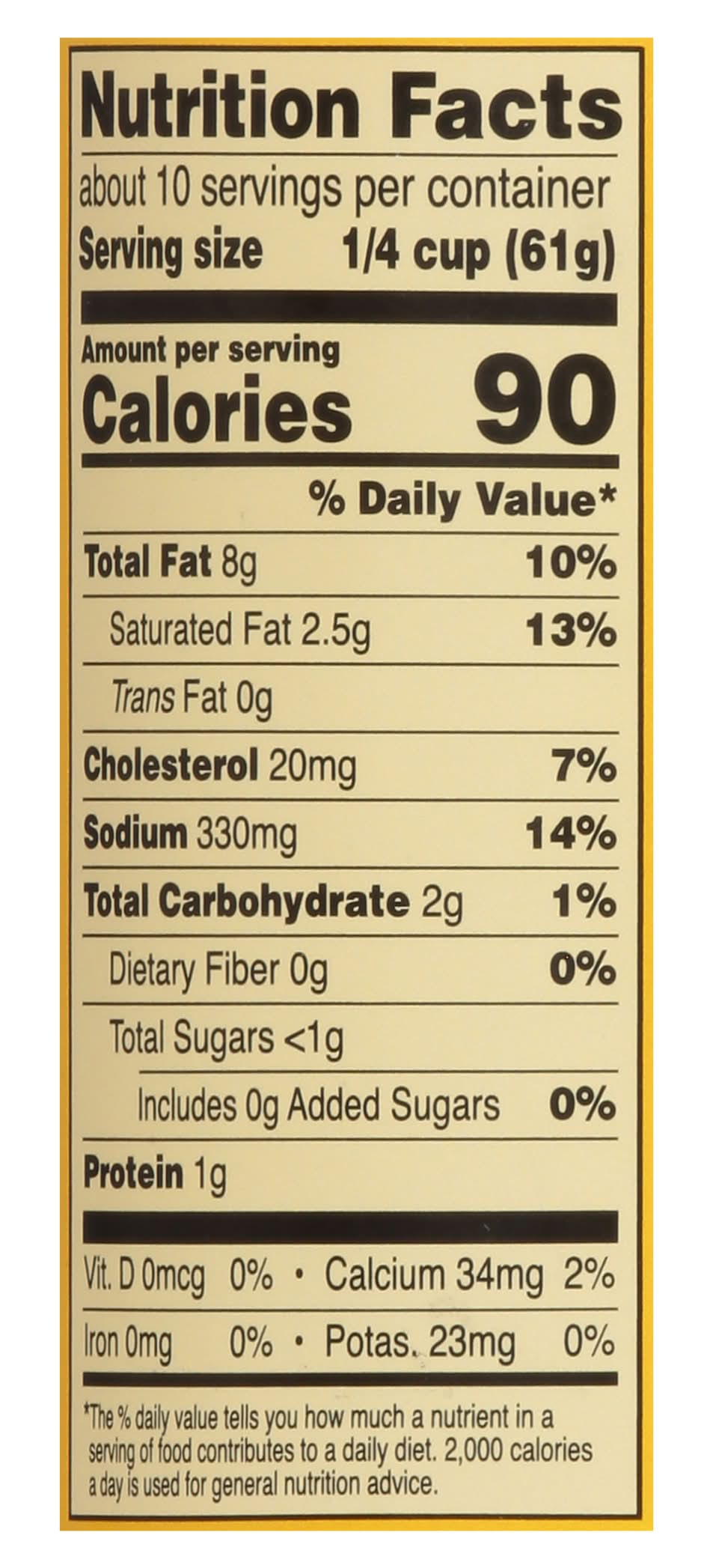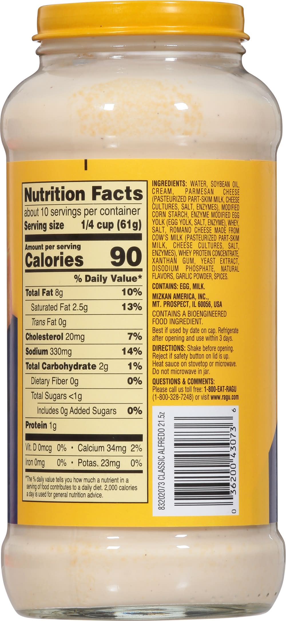 Ingredients: Ingredients, Water, Soybean Oil, Cream, Parmesan Cheese (Pasteurized Part-Skim Milk, Cheese Cultures, Salt, Enzymes), Modified Corn Starch, Enzyme Modified Egg Yolk (Egg Yolk, Salt, Enzyme), Whey, Salt, Romano Cheese Made from Cow's Milk (Pasteurized Part Skim Milk, Cheese Cultures, Salt, Enzymes), Whey Protein Concentrate, Xanthan Gum, Yeast Extract, Disodium Phosphate, Natural Flavors, Garlic Powder, Spices Contains: Eggs, Milk, Soybeans, Corn