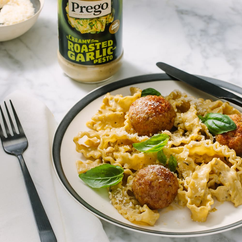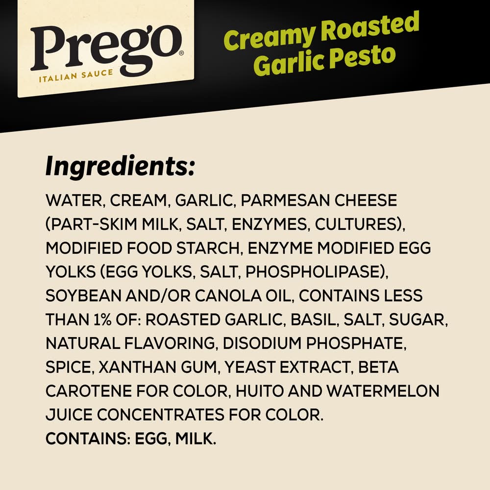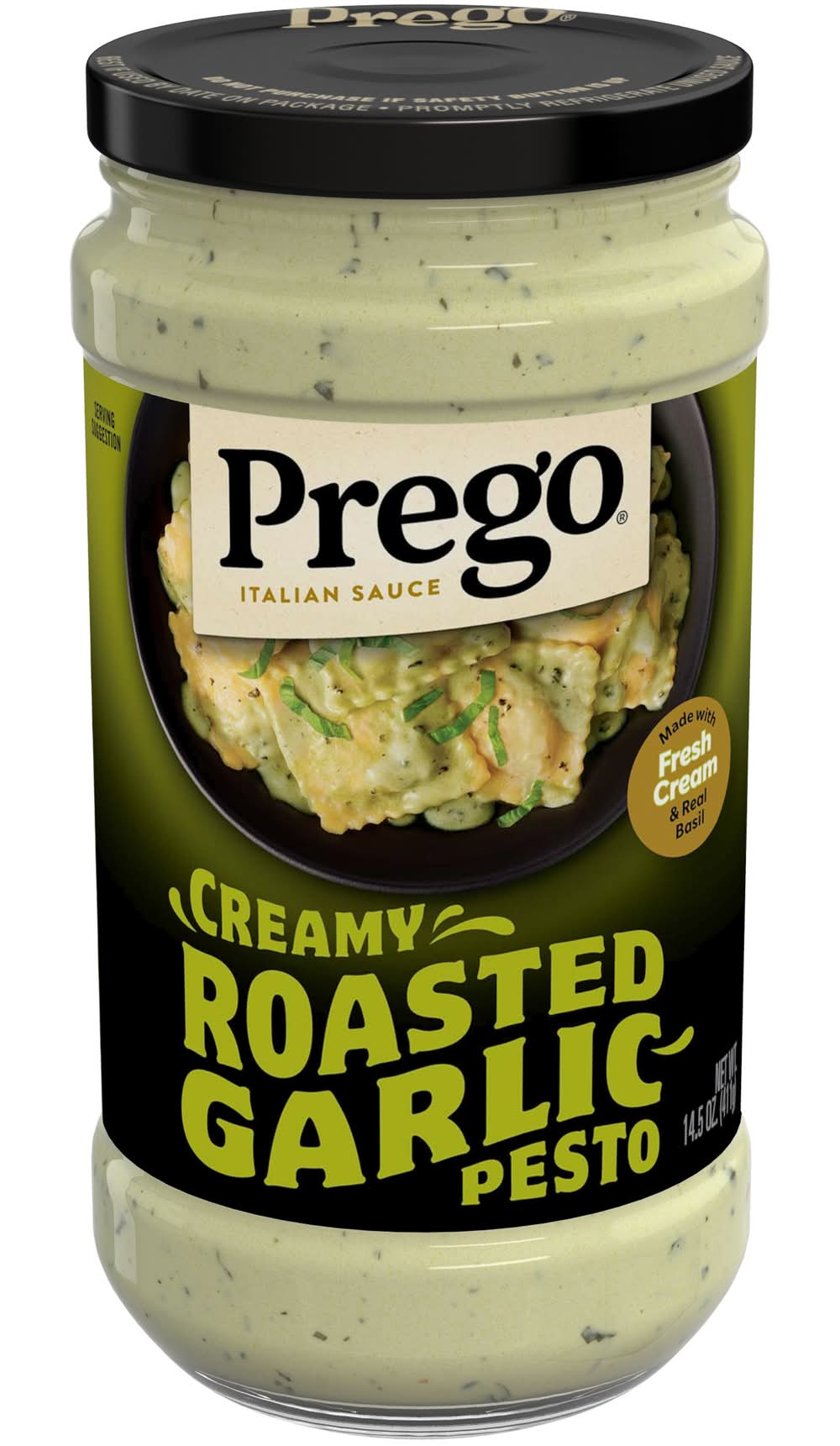 Be the hero at dinner with Prego Creamy Roasted Garlic Pesto Pasta Sauce. Prego Creamy Roasted Garlic Pesto Sauce is made with fresh cream, Parmesan cheese, real basil and roasted garlic for a unique twist on a classic. Combining the creaminess of Alfredo sauce with the bright, herby taste of pesto, this versatile cream sauce is a rich and flavorful addition to any dish. Toss it with your favorite pasta for an easy, comforting meal, or use it in recipes like Creamy Pesto Flatbreads. Flavor: Roasted garlic
