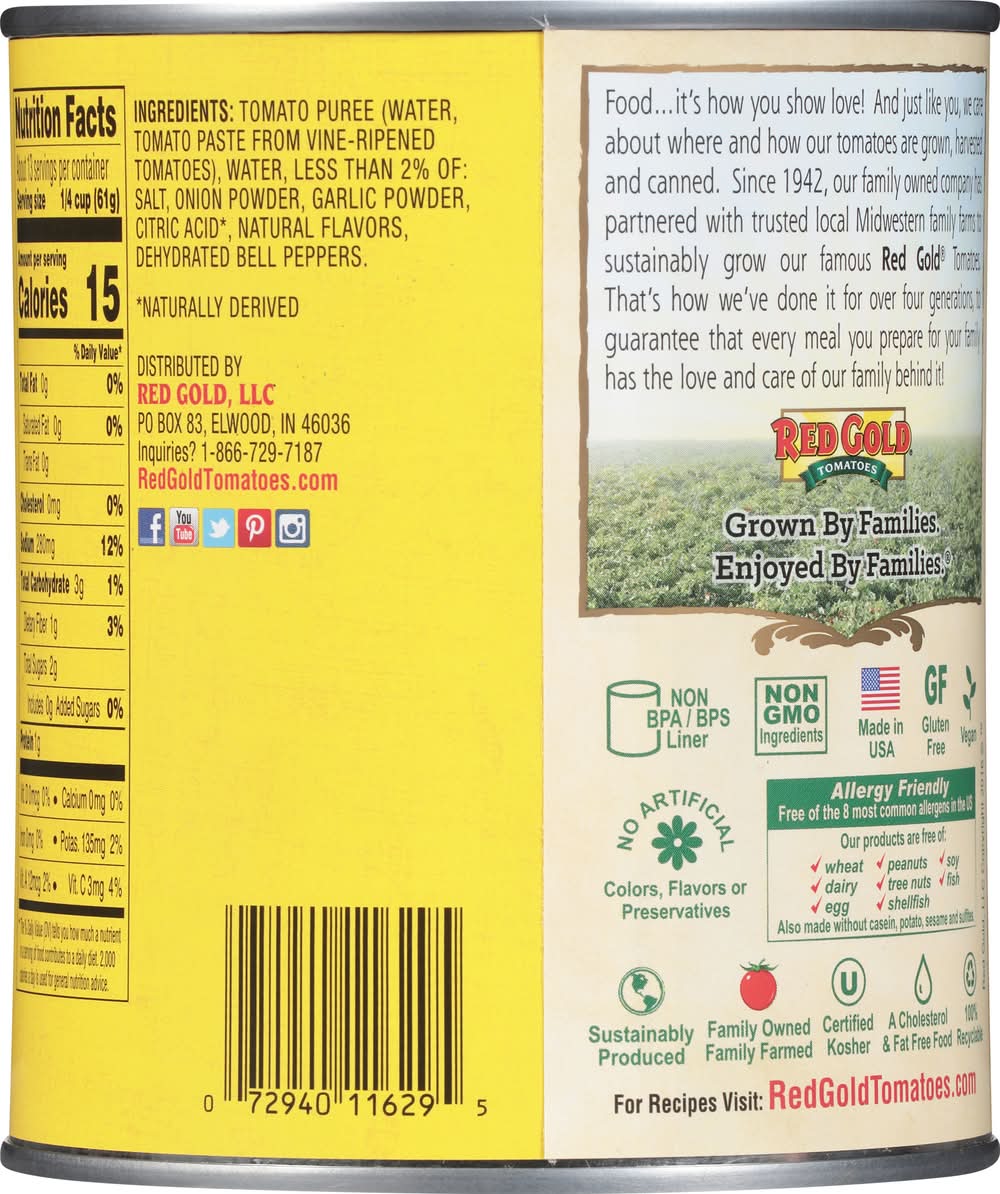 Sauce, Tomato • Number of servings: 13 • Red Gold, LLC, Elwood, IN, 46036, Ph: 866-729-7187