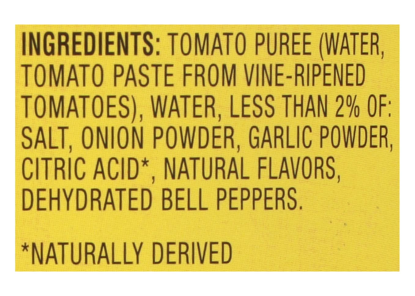 Ingredients: Tomato Puree (Water, Tomato Paste from Vine-Ripened Tomatoes), Water, Less than 2% of: Salt, Onion Powder, Garlic Powder, Citric Acid (Naturally Derived), Natural Flavors, Dehydrated Bell Peppers Contains: 'Free From Gluten', 'Free From Wheat', 'Free From Milk', 'Free From Eggs', 'Free From Peanuts', 'Free From Tree Nuts', 'Free From Sesame', 'Free From Soybeans', 'Free From Fish'