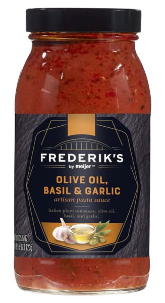 Frederiks By Meijer Olive Oil, Basil and Garlic Artisan Pasta Sauce (25.3 oz) is crafted to bring authentic Italian flavors into your kitchen. This sauce combines juicy tomatoes, smooth olive oil, fresh basil, and spicy garlic to elevate simple dishes to gourmet meals. It is designed to make any boxed pasta taste like it was made from scratch in an Italian home. With its balanced and smooth texture, it is crafted to satisfy everyone who gathers at your table. The artisan approach ensures only the finest ingredients are used, echoing the care traditionally taken in Italian cooking.