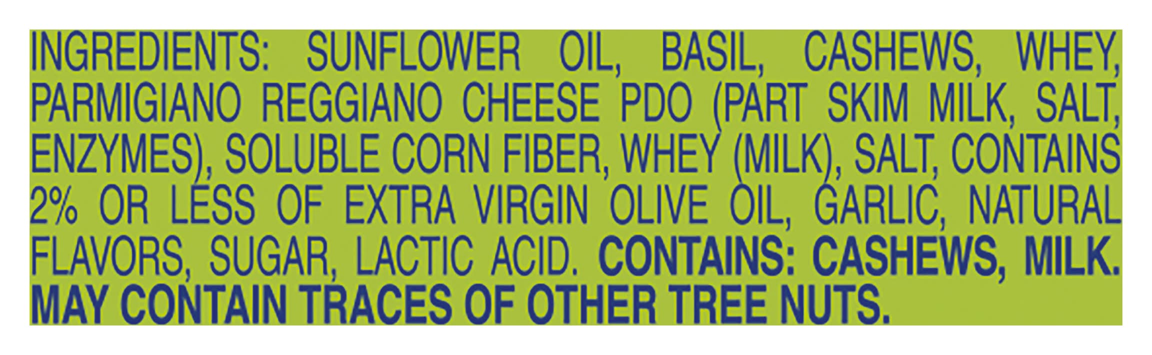 Ingredients: Sunflower Oil, Basil, Cashews, Whey Parmigiano Reggiano Cheese Pdo (Part Skim Milk, Salt Enzymes), Soluble Corn Fiber, Whey (Milk), Salt, Contains 2% or Less of Extra Virgin Olive Oil, Garlic, Natural Flavors, Sugar, Lactic Acid Contains: Tree Nuts, Cashews, Milk, Corn, Tree Nuts