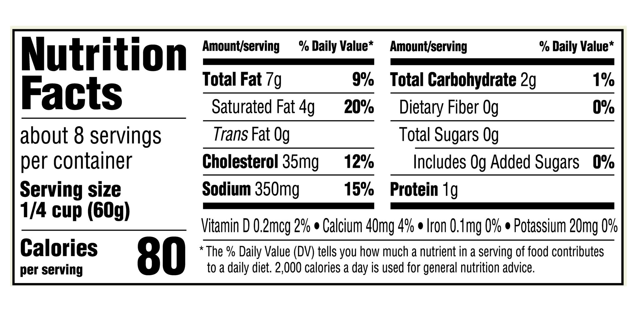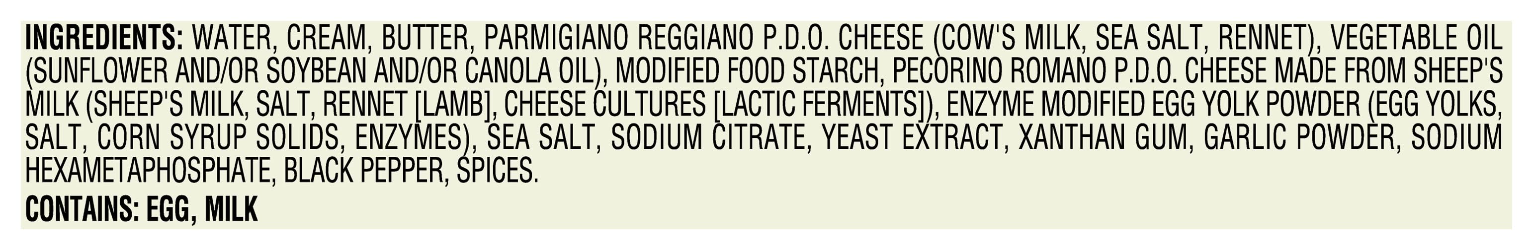 Ingredients: Water, Cream, Butter, Parmigiano Reggiano PDO Cheese (Milk, Sea Salt, Enzyme), Sunflower Oil, Modified Corn Starch, Pecorino Romano PDO Cheese Made from Sheep’s Milk (Sheep’s Milk, Salt, Enzyme), Egg Yolk Powder (Dried Egg Yolks, Salt, Corn Syrup), Salt, Sodium Citrate, Yeast Extract, Xanthan Gum, Garlic Powder, Sodium Phosphate, Spices Contains: Milk, Eggs, Corn