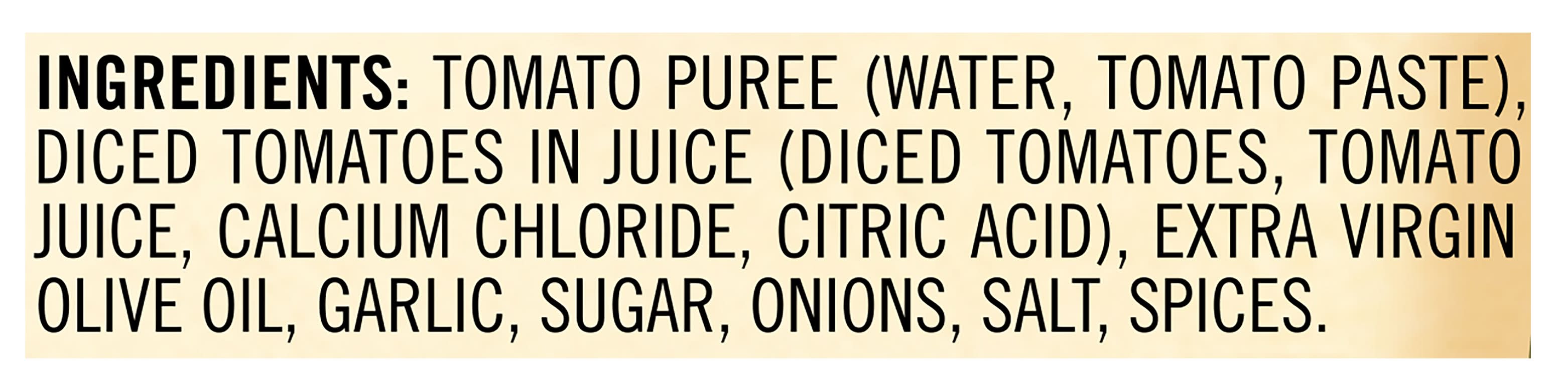 Ingredients: Tomato Puree (Water Tomato Paste), Diced Tomatoes in Juice (Diced Tomatoes Tomato Juice Calcium Chloride Citric Acid), Extra Virgin Olive Oil, Garlic, Sugar, Onions, Salt, Spices