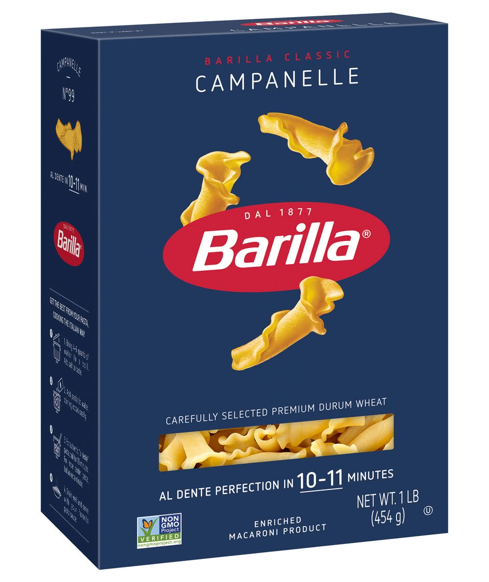 Campanelle • Number of servings: 8 • Barilla America, Inc., Northbrook, IL, 60062, Ph: 800-922-7455 • Packaging: Reusable