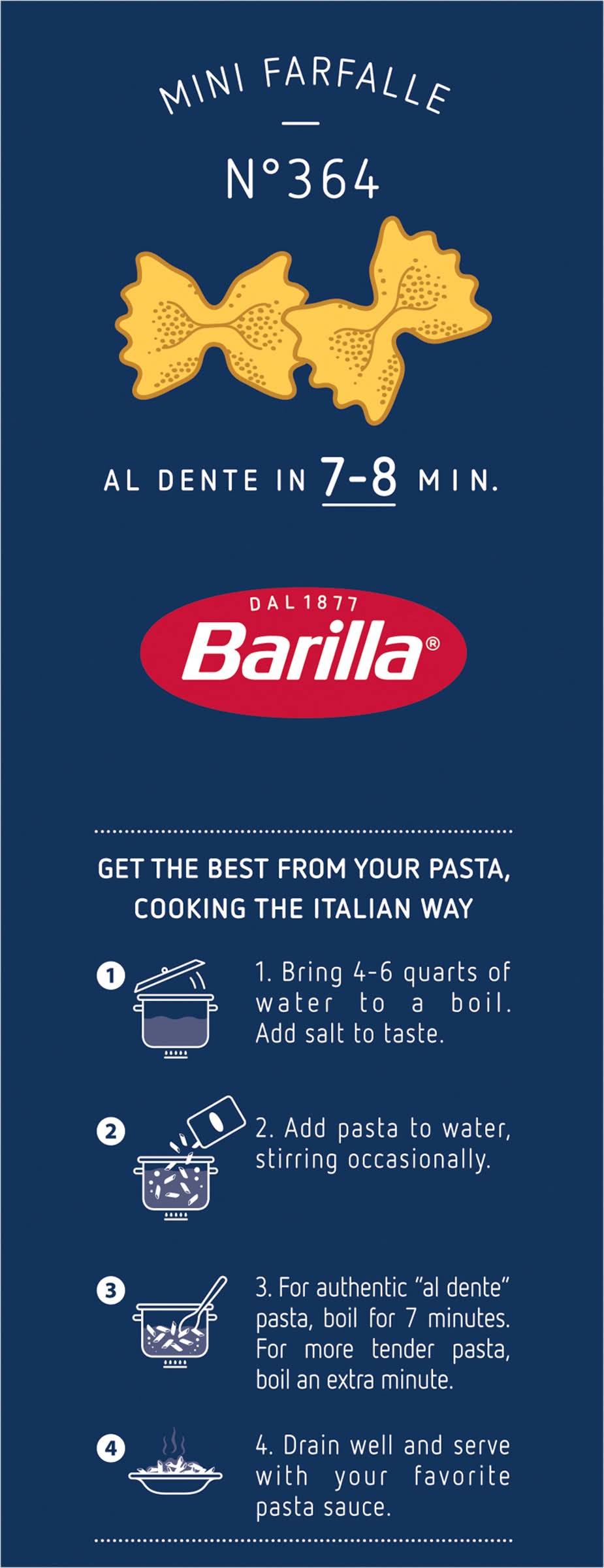 Get the best from your pasta, cooking the italian way. 1. bring 4-6 quarts of water to a boil. add salt to taste. 2. add pasta to water, stirring occasionally. 3. for authentic al dente pasta, boil for 7 minutes. for more tender pasta, boil an extra minute. 4. drain well and serve with your favorite pasta sauce. to open, lift tab.