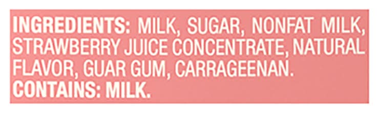 Ingredients: Milk, Sugar, Nonfat Milk, Strawberry Juice Concentrate, Natural Flavor, Guar Gum, Carrageenan Contains: Milk