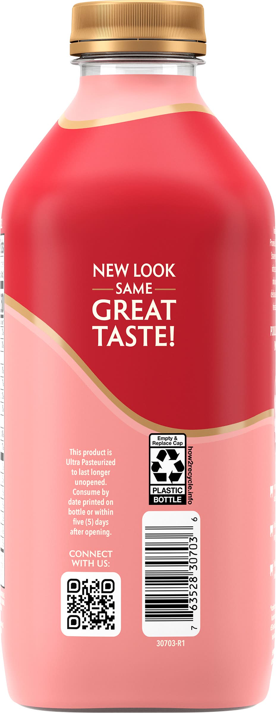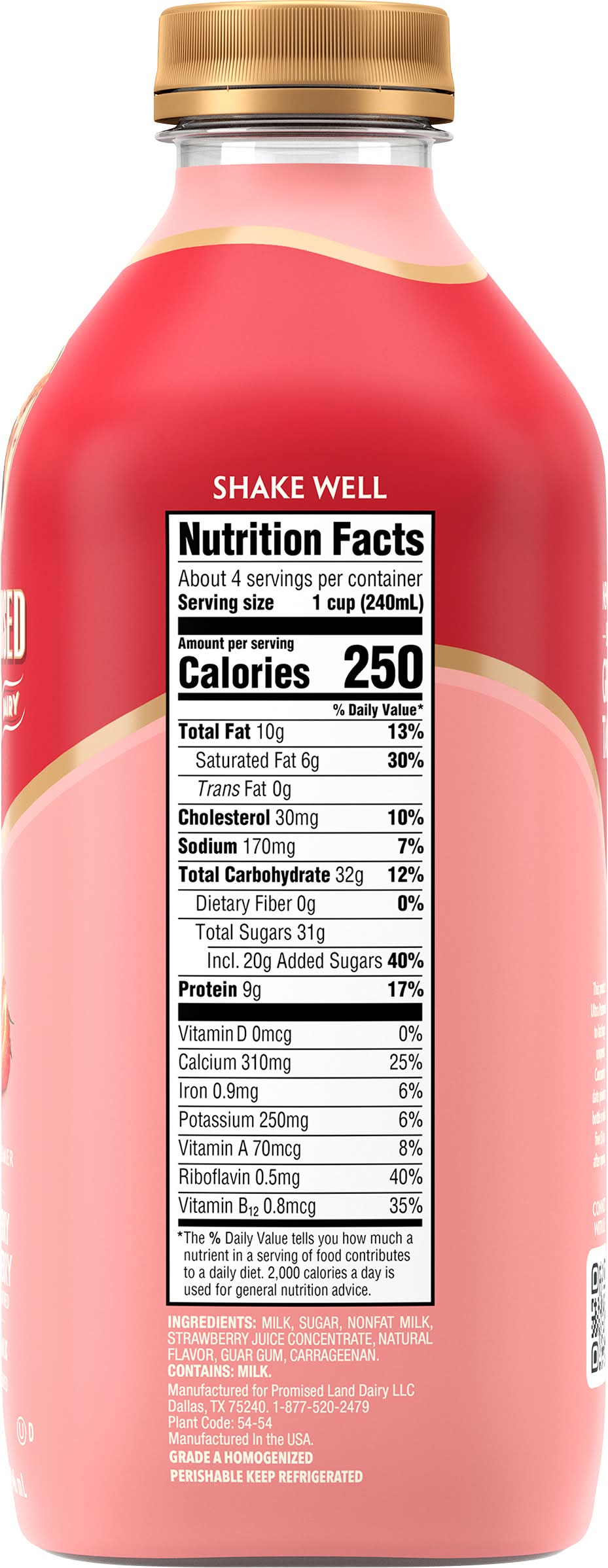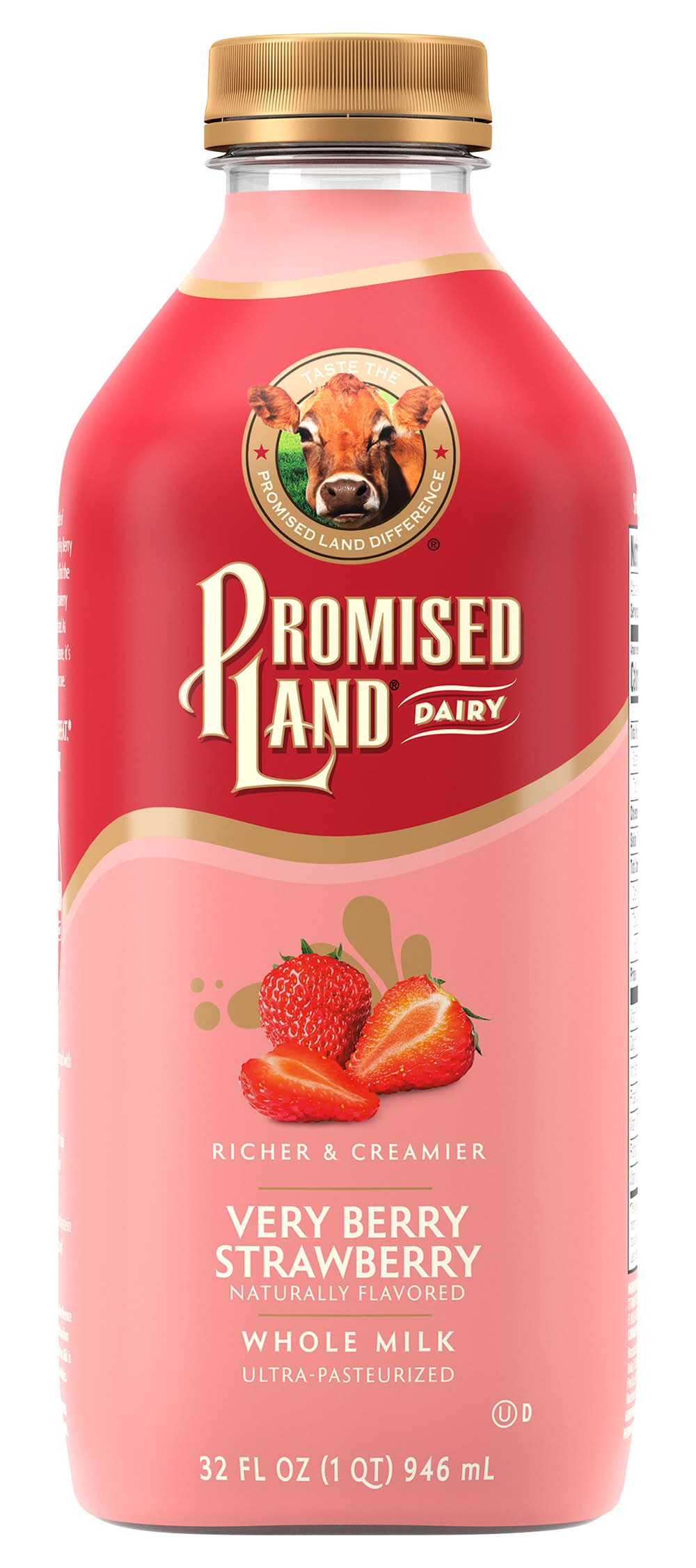 Just-Picked Flavor in Every Sip Treat yourself to the delectable flavor of strawberries, blended with extraordinarily rich and creamy Jersey milk for an irresistible indulgence that tastes like it's straight from the strawberry patch. Extraordinary Cows Extraordinary Milk? At Promised Land Dairy, our Jersey cows are anything but ordinary, tracing their origins back to the British Isle of Jersey. Less than 10% of the dairy cows in America are Jerseys, and their milk is naturally richer and creamier than ordinary milk. Since we started in 1987, we've always ensured that every bottle of milk we produce contains the highest amount quality and care, but never any artificial colors, flavors, growth hormones* or preservatives. So, while there are ways to naturally give our strawberry milk a more familiar pink color, we believe in keeping it just the way it is. • Flavor: Very berry strawberry • Packaging: Reusable