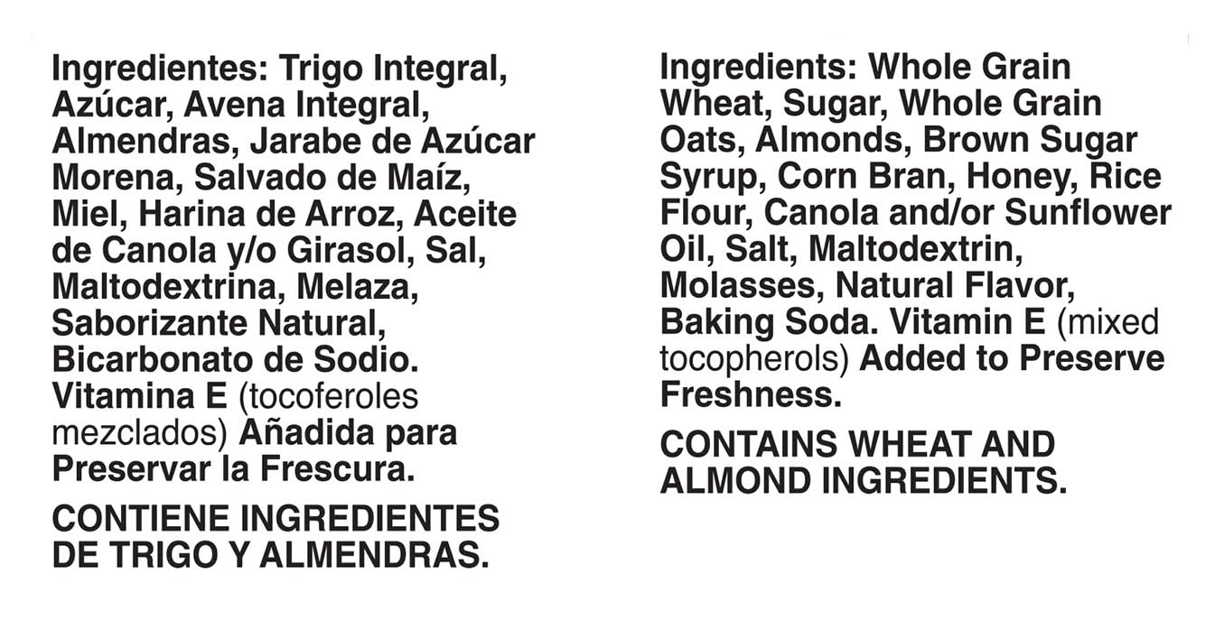 Ingredients: Whole Grain Wheat, Sugar, Whole Grain Oats, Almonds, Brown Sugar Syrup, Corn Bran, Honey, Rice Flour, Canola and/or Sunflower Oil, Salt, Maltodextrin, Molasses, Natural Flavor, Baking Soda, Vitamin E (Mixed Tocopherols) Added to Preserve Freshness Contains: Wheat, Oat, Tree Nuts, Almonds Additives: Genetically Modified Ingredients
