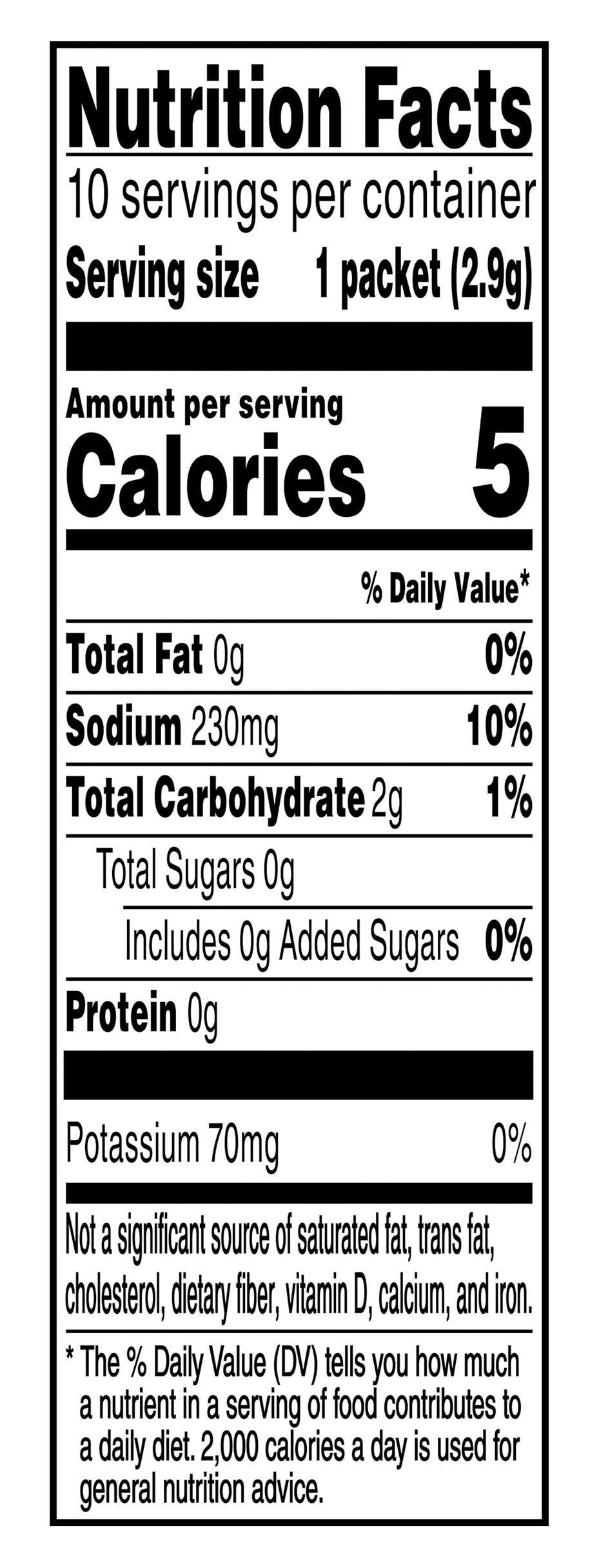 Ingredients: Citric Acid, Sodium Citrate, Salt, Maltodextrin, Monopotassium Phosphate, Natural Flavor, Modified Tapioca Starch, Sucralose, Red 40, Acesulfame Potassium, Silicon Dioxide