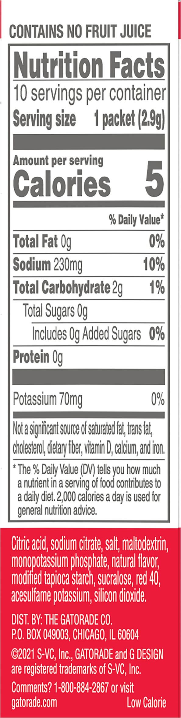 Natural flavor. 5 Calories per pack. Zero sugar. Low calorie. Zero Sugar: Gatorade Zero has 0 g sugar with the same electrolytes as Gatorade Thirst Quencher. Electrolytes: Hydration with 230 mg sodium and 70 mg potassium to help replace what you sweat out. Rehydrate. Replenish. Electrolytes to help replenish what you lose in sweat. Contains no fruit juice. • Flavor: Fruit punch • The Gatorade Co., PO Box 049003, Chicago, IL.