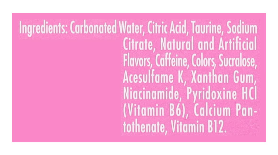 Ingredients: Carbonated Water, Citric Acid, Taurine, Sodium Citrate, Natural and Artificial Flavors, Caffeine, Colors, Sucralose, Acesulfame K, Xanthan Gum, Niacinamide, Pyridoxine HCl (Vitamin B6), Calcium Pantothenate, Vitamin B12.