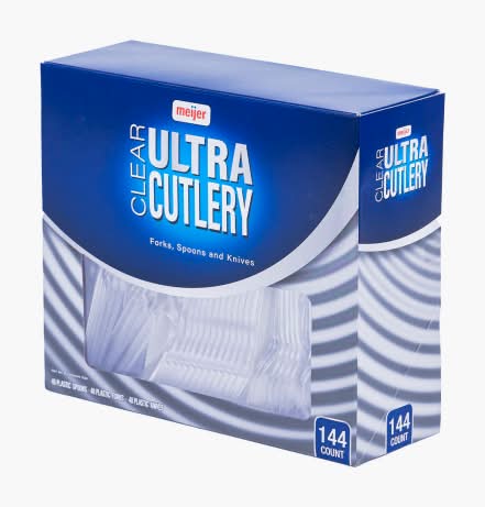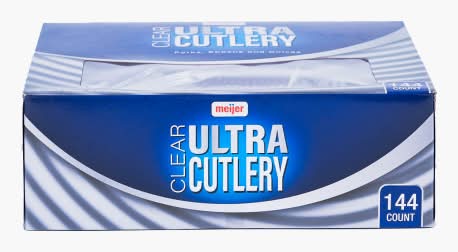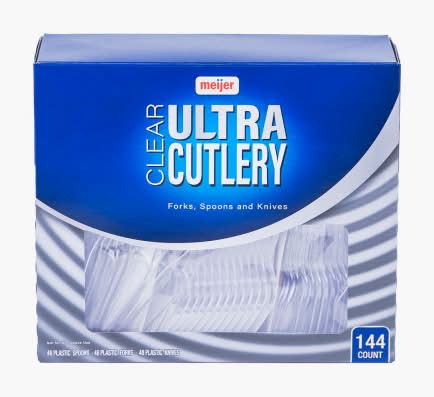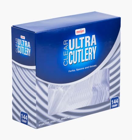 Meijer Clear Plastic Cutlery, Variety offers a selection of full-size, clear plastic utensils, comprising forks, knives, and spoons. These utensils are noted for their strength and durability, making them suitable for a range of uses.