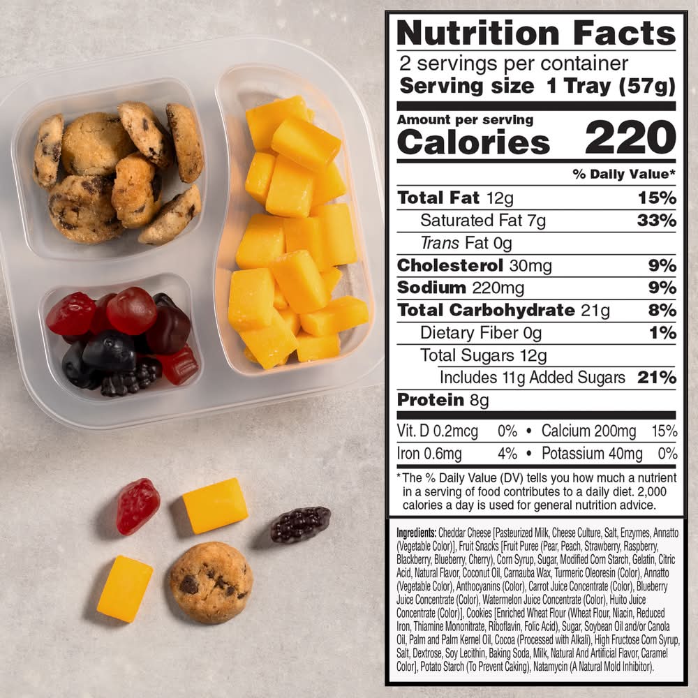 Ingredients: Cheddar Cheese [Pasteurized Milk, Cheese Culture, Salt, Enzymes, Annatto (Vegetable Color)], Cocoa Yogurt Flavored with Other Natural Flavor Covered Raisins [Greek Yogurt Flavored Confectionary Coating (Sugar Palm Kernel Oil Pasteurized Skim Milk Greek Yogurt Powder (Skim Milk Powder Culture Lactic Acid Natural Flavor), Lactic Acid, Soy Lecithin, Natural Flavor), Raisins, Cocoa Powder, Gum Acacia, Sugar, Confectioner's Glaze (Shellac)], Cookies [Unbleached Enriched Wheat Flour (Wheat Flour Niacin Reduced Iron Thiamine Mononitrate (Vitamin B1), Riboflavin (Vitamin B2), Folic Acid), Sugar, Soybean and/or Canola Oil, Palm and Palm Kernel Oil, Cocoa (Processed with Alkali), High Fructose Corn Syrup, Salt, Dextrose, Soy Lecithin, Baking Soda, Milk, Natural and Artificial Flavor, Caramel Color], Potato Starch (to Prevent Caking), Natamycin (a Natural Mold Inhibitor) Contains: Made in a facility that also processes Peanuts and Tree Nuts