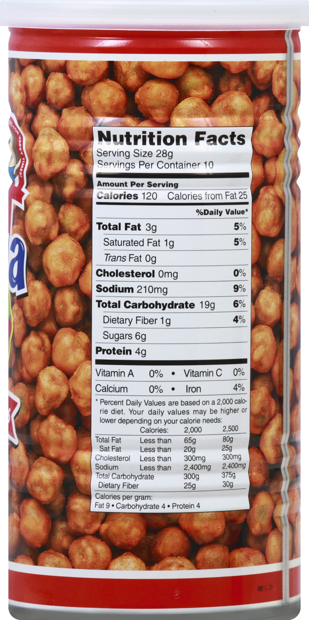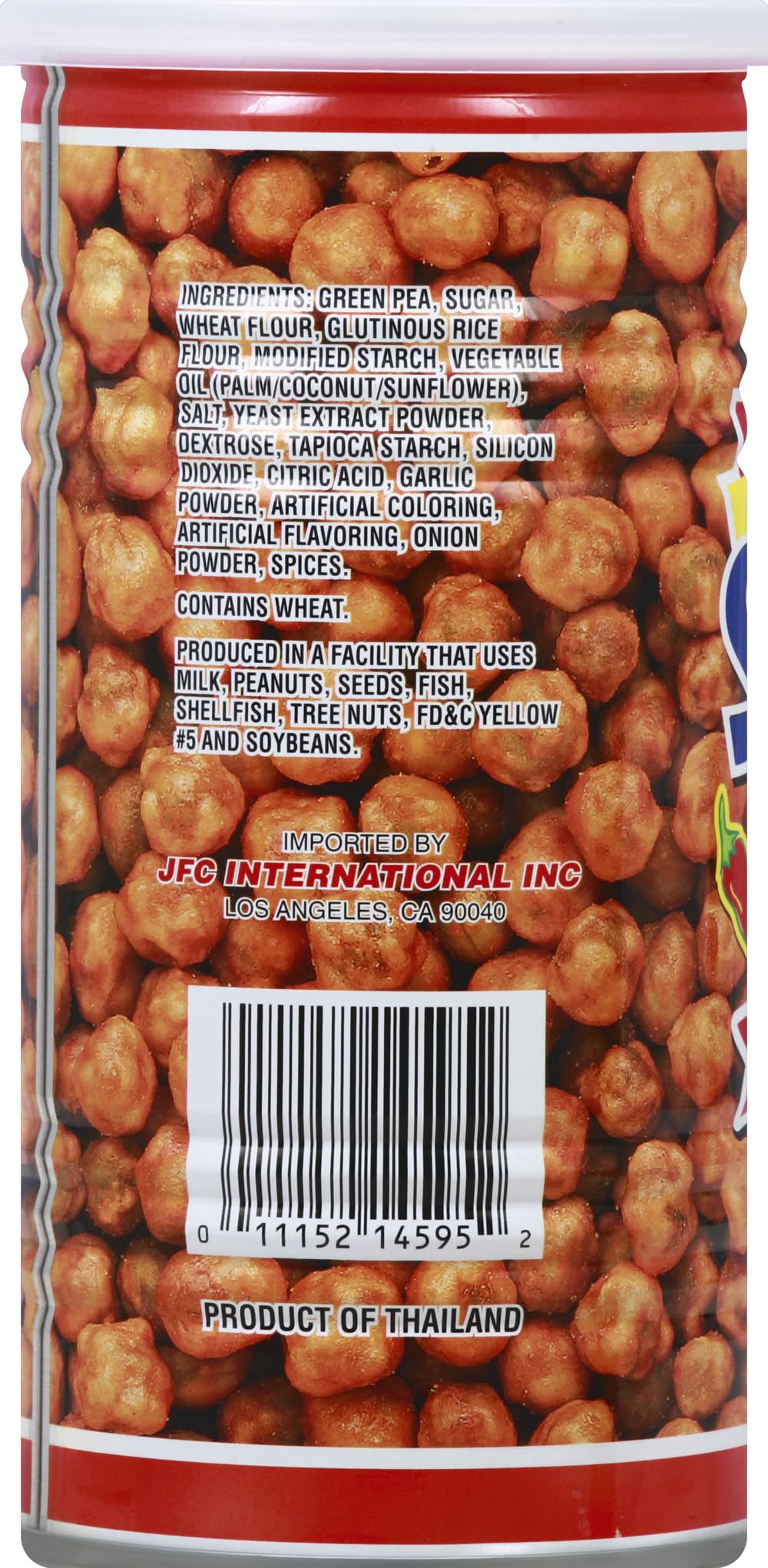 Ingredients: Green Pea, Sugar, Wheat Flour, Glutinous Rice Flour, Modified Starch, Vegetable Oil (Palm/Coconut/Sunflower), Salt, Yeast Extract Powder, Dextrose, Tapioca Starch, Silicon Dioxide, Citric Acid, Garlic Powder, Artificial Coloring, Artificial Flavoring, Onion Powder, Spices Contains: Wheat, Milk, Peanuts, Tree Nuts, Fish, Soybeans
