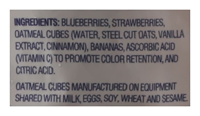 Ingredients: Blueberries, Strawberries, Oatmeal Cubes (Water, Steel Cut Oats, Vanilla Extract, Cinnamon), Bananas, Ascorbic Acid (Vitamin C) to Promote Color Retention, and Citric Acid Contains: Oat, Milk, Eggs, Soybeans, Wheat, Sesame