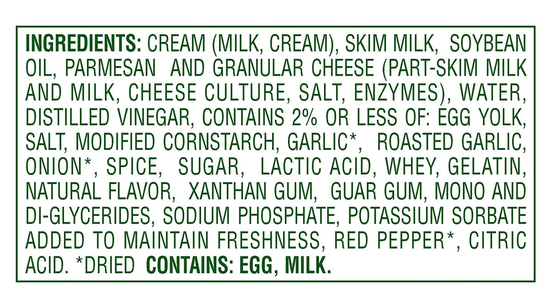 Ingredients: Cream (Milk, Cream), Skim Milk, Soybean Oil, Parmesan and Granular Cheese (Part-Skim Milk and Milk, Cheese Culture, Salt, Enzymes), Water, Distilled Vinegar, Contains 2% or Less of: Egg Yolk, Salt, Modified Cornstarch, Garlic*, Roasted Garlic, Onion*, Spice, Sugar, Lactic Acid, Whey, Gelatin, Natural Flavor, Xanthan Gum, Guar Gum, Mono and Di-Glycerides, Sodium Phosphate, Potassium Sorbate Added to Maintain Freshness, Red Pepper*, Citric Acid, * Dried Contains: Eggs, Milk, Soybeans, Corn