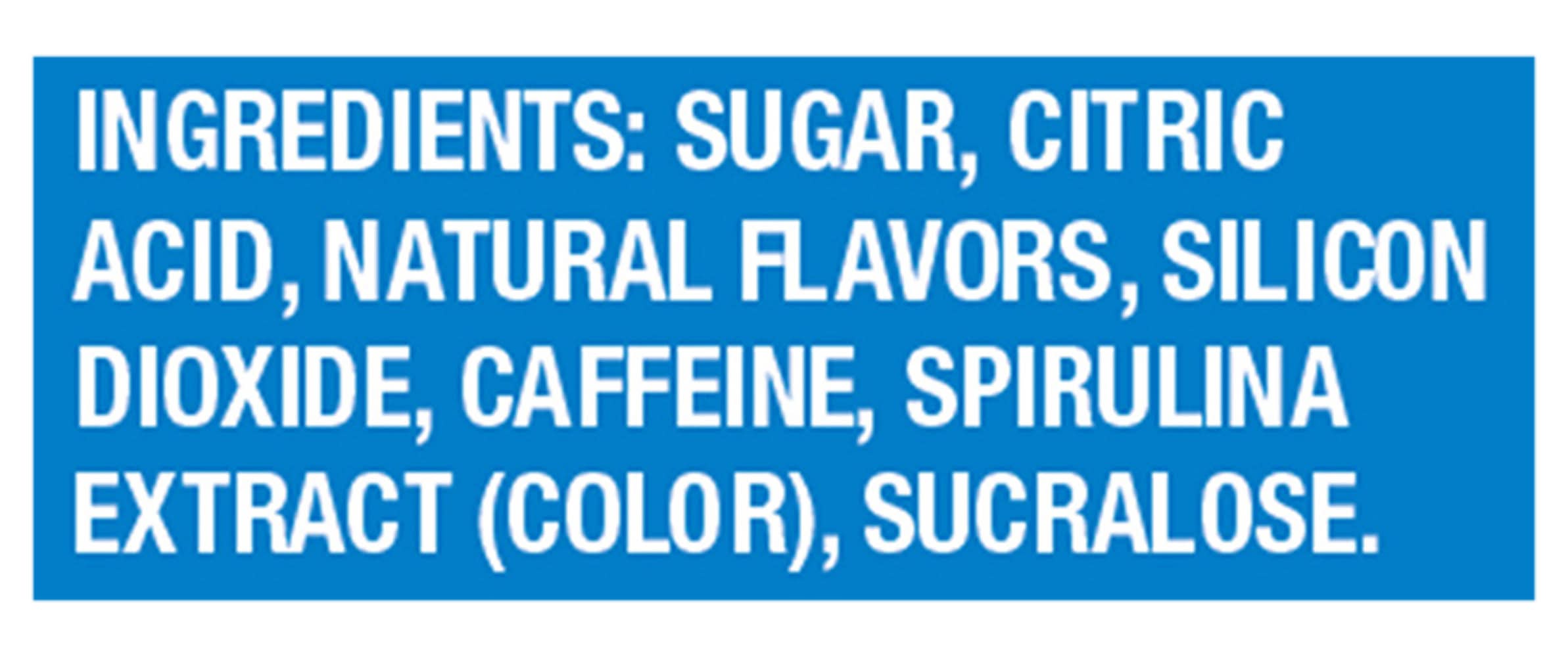 Ingredients: Sugar, Citric Acid, Natural Flavors, Silicon Dioxide, Caffeine, Spirulina Extract (Color), Sucralose