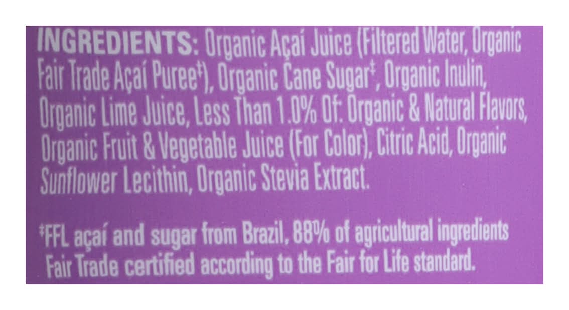 Ingredients: Organic Acai Juice (Filtered Water, Organic Fair Trade Acai Puree(a)), Organic Cane Sugar(a), Organic Inulin, Organic Lime Juice, Less than 1.0% of Organic & Natural Flavors, Organic Fruit & Vegetable Juice (for Color), Citric Acid, Organic Sunflower Lecithin, Organic Stevia Extract. (a) FFL Acai and Sugar from Brazil, 88% of Agricultural Ingredients Fair Trade Certified According to the Fair for Life Standard