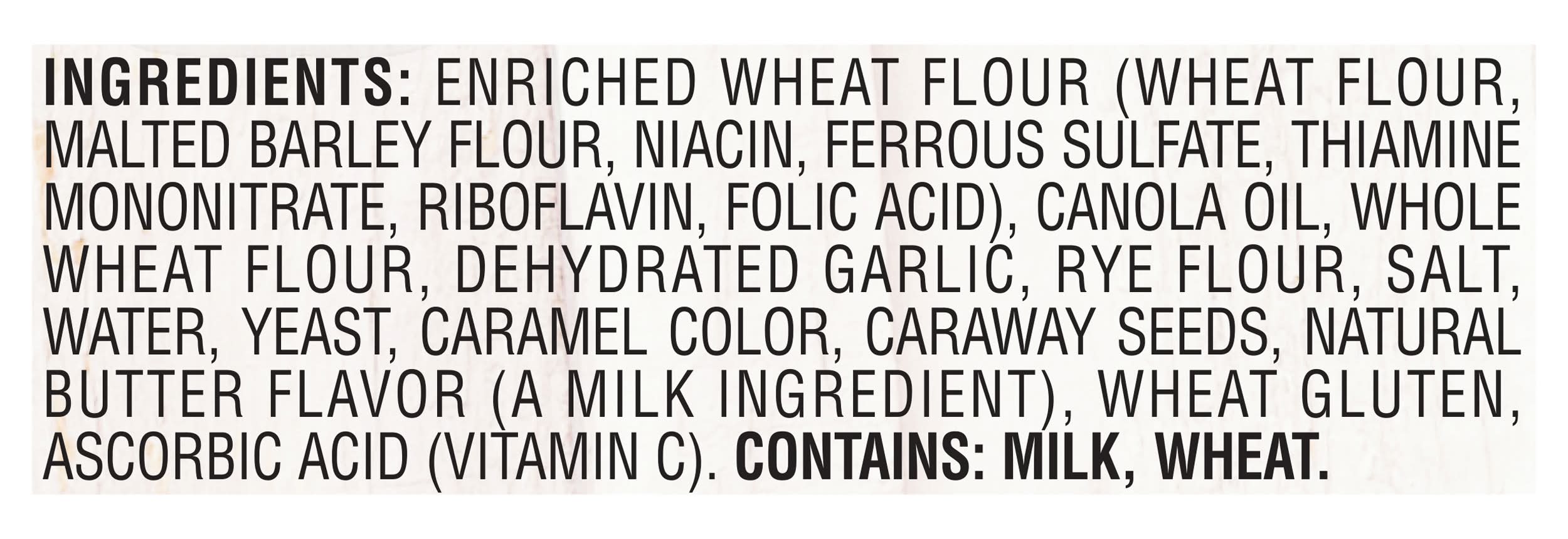 Ingredients: Enriched Wheat Flour (Wheat Flour, Malted Barley Flour, Niacin, Ferrous Sulfate, Thiamine Mononitrate, Riboflavin, Folic Acid), Canola Oil, Whole Wheat Flour, Dehydrated Garlic, Rye Flour, Salt, Water, Yeast, Caramel Color, Caraway Seeds, Natural Butter Flavor (a Milk Ingredient), Wheat Gluten, Ascorbic Acid (Vitamin C). Contains: Milk, Barley, Gluten, Wheat
