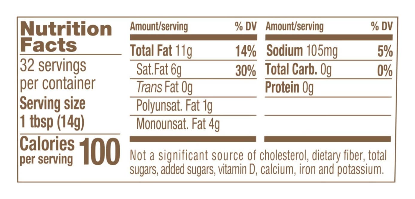 Ingredients: Blend of Plant-Based Oils (Palm Fruit, Palm Kernel and Canola), Water, Salt, Pea Protein, Glucose, Sunflower Lecithin, Citric Acid, Natural Flavors, Beta Carotene (Color) Contains: Soybeans