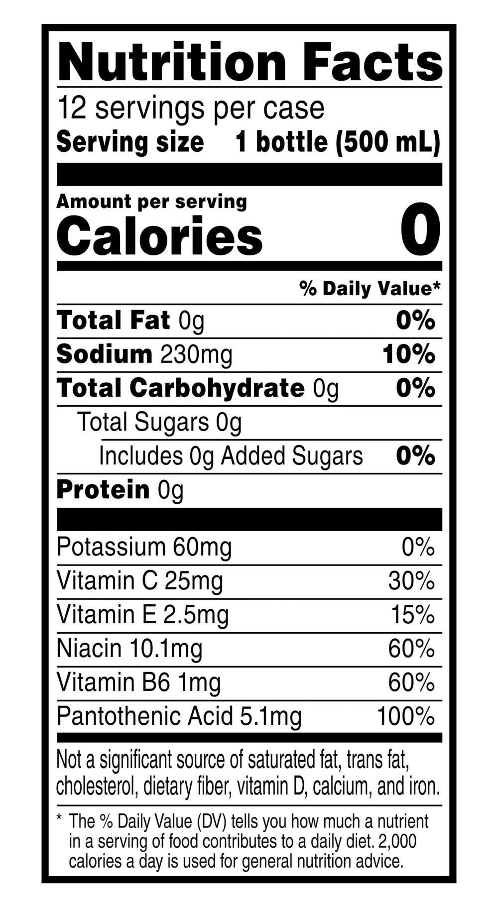 Ingredients: Water, Citric Acid, Sodium Hexametaphosphate (to Protect Flavor), Natural Flavor, Salt, Potassium Sorbate (Preserves Freshness), Potassium Citrate, Sodium Citrate, Ascorbic Acid (Vitamin C), Sucralose, Acesulfame Potassium, Calcium Disodium EDTA (to Protect Flavor), Calcium Pantothenate (Vitamin B5), Niacinamide (Vitamin B3), Vitamin E Acetate, Pyridoxine Hydrochloride (Vitamin B6)