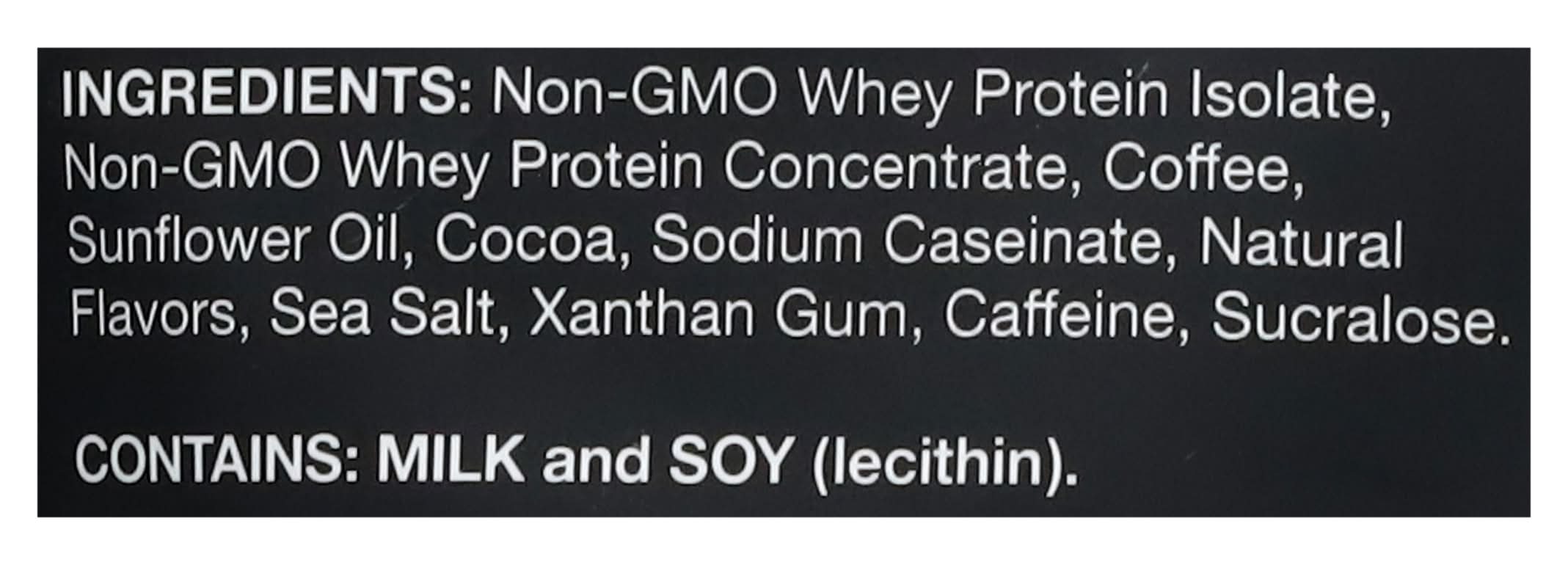 Ingredients: Non-GMO Whey Protein Isolate, Non-GMO Whey Protein Concentrate, Coffee, Sunflower Oil, Cocoa, Sodium Caseinate, Natural Flavors, Sea Salt, Xanthan Gum, Caffeine, Sucralose Contains: Milk, Soybeans