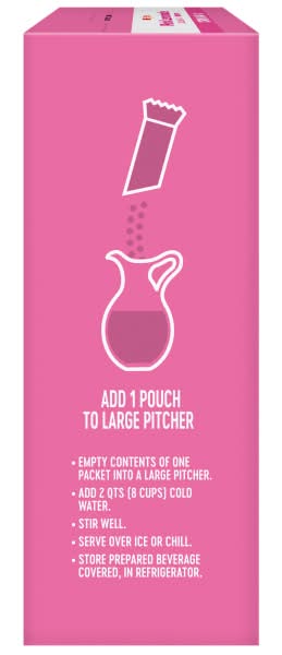 Meijer Pink Lemonade Drink Mix offers the classic sweet-meets-tart flavor of pink lemonade and is designed for easy preparation. It is portable, allowing for the convenience of enjoying lemonade on the go. To prepare, one needs to tear open a packet, add it to water, and stir, making it suitable for creating a quick and refreshing beverage.