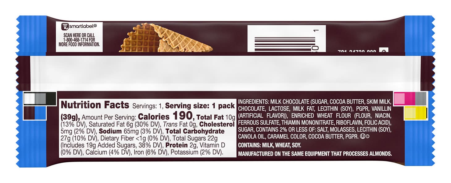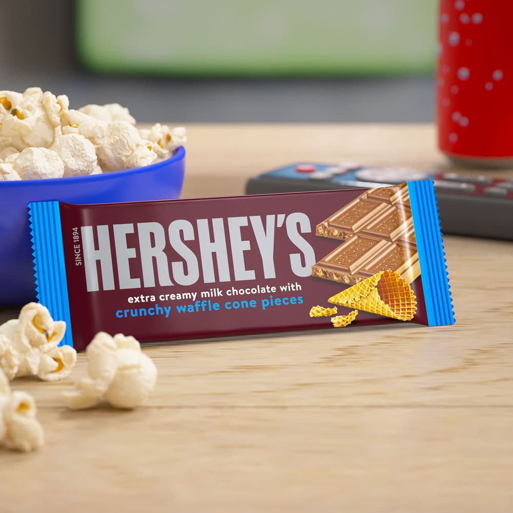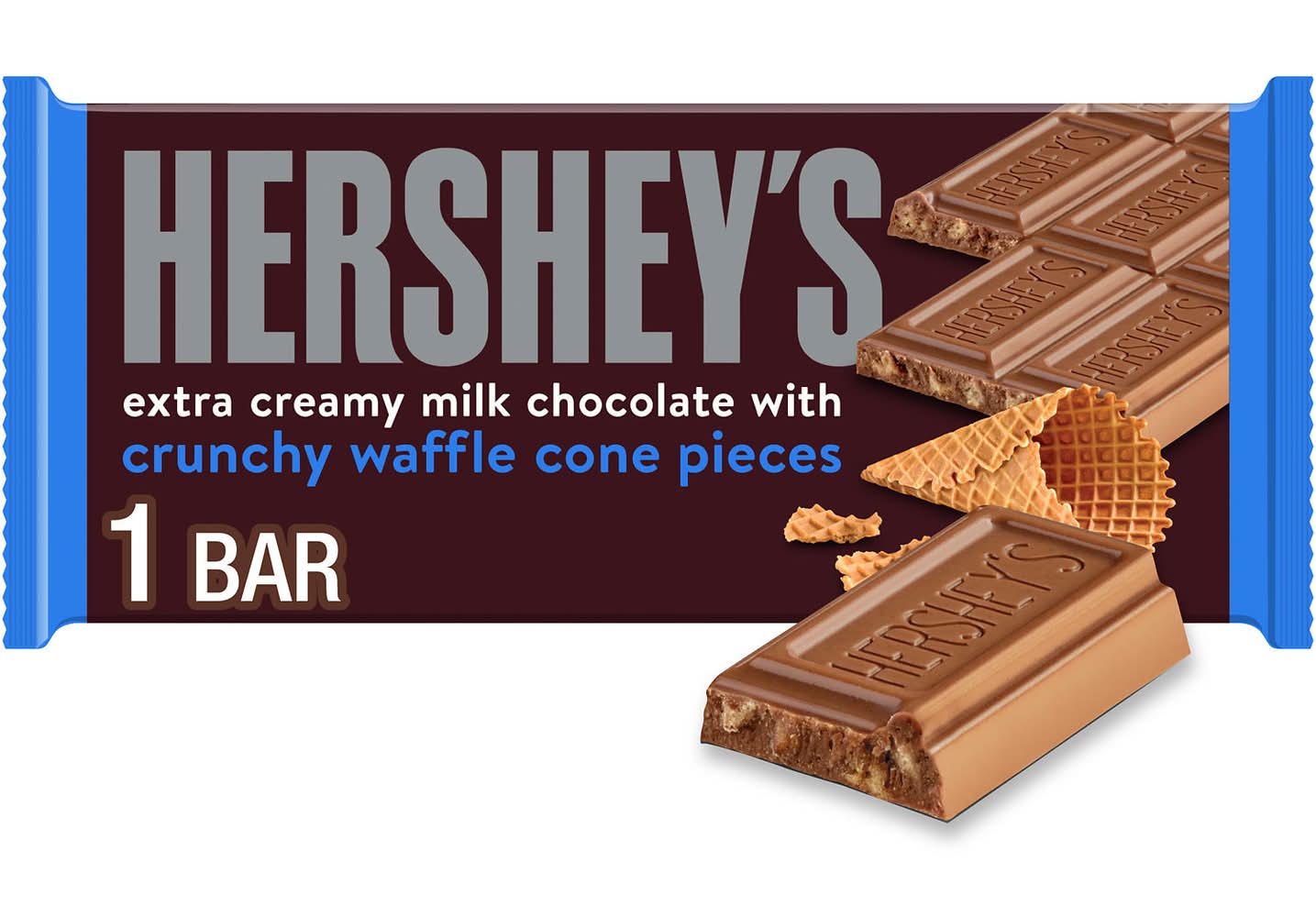 Extra creamy milk chocolate and crunchy waffle cone pieces all in one bar? Who says you can't have it all? These kosher candy bars are a twist on the classic chocolate you already know and love. Keep a full size bar with you at home or work, and you'll always have a decadent treat within reach. Whether you enjoy it on your own or share it with friends or family, it's sure to be a delicious treat for everyone involved. Whether you need Easter candy, Halloween treats, Christmas sweets or Valentine's Day gifts to make those around you swoon, HERSHEY'S extra creamy milk chocolate candy will take care of any sweet snacking requirement. You can make any day a special one, once you get your hands on this creamy chocolate bar with crunchy waffle cone pieces. Break this bar into perfectly shareable sections at work, on road trips and at home to enjoy the smooth, extra creamy milk chocolate along for the ride. Feeling creative in the kitchen? Try adding sections of this chocolate candy bar on top of cookies or cakes, or include them in your s'mores. There's no wrong way to enjoy creamy chocolate and crunchy waffle cone pieces!