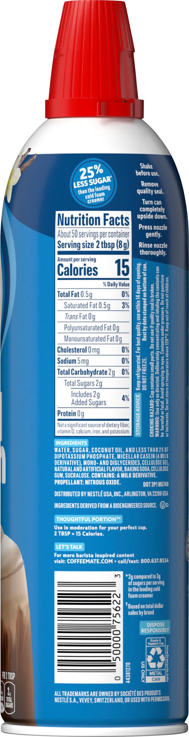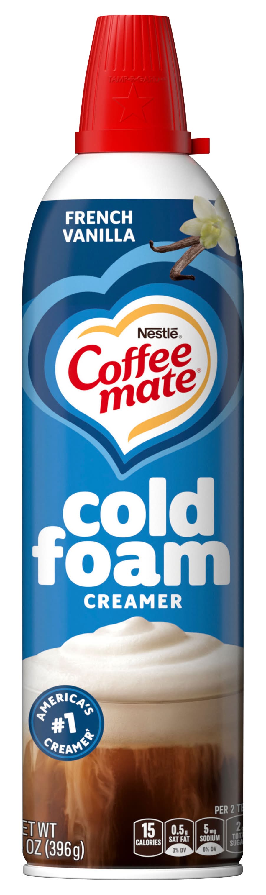 It’s time to make your coffee breaks iconic with Coffee mate Cold Foam Coffee Creamer. You’re going to fall in love with our cold foam coffee creamer, taking you from your early morning grind to your late-night fuel up. We’re here for your coffee mug, cup or martini glass our cold foam is ready to sweeten any cup. Dietary preferences? We have those covered Our Coffee mate creamer is non-dairy, cholesterol-free, and gluten-free. We really like coffee. No fancy equipment is necessary. All you need to do is shake, press and enjoy our cold foam creamer Hot or cold! Keep your coffee creamer cool in the fridge for up to 14 days. • Flavor: French vanilla • Packaging: Reusable