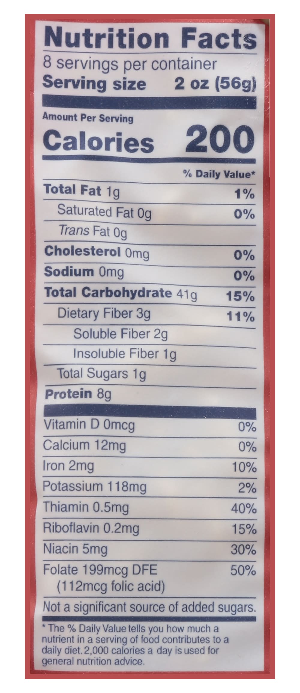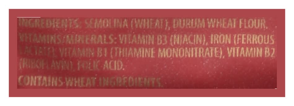 Ingredients: Semolina (Wheat), Durum Wheat Flour. Vitamins/Minerals: Vitamin B3 (Niacin), Iron (Ferrous Lactate), Vitamin B1 (Thiamine Mononitrate), Vitamin B2 (Riboflavin), Folic Acid Contains: Wheat