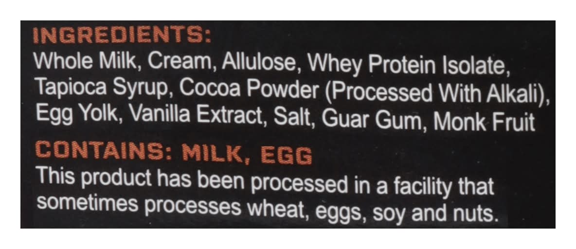 Ingredients: Whole Milk, Cream, Allulose, Whey Protein Isolate, Tapioca Syrup, Cocoa Powder (Processed with Alkali), Egg Yolk, Vanilla Extract, Salt, Guar Gum, Monk Fruit Contains: Milk, Eggs, Wheat, Eggs, Soybeans, Tree Nuts