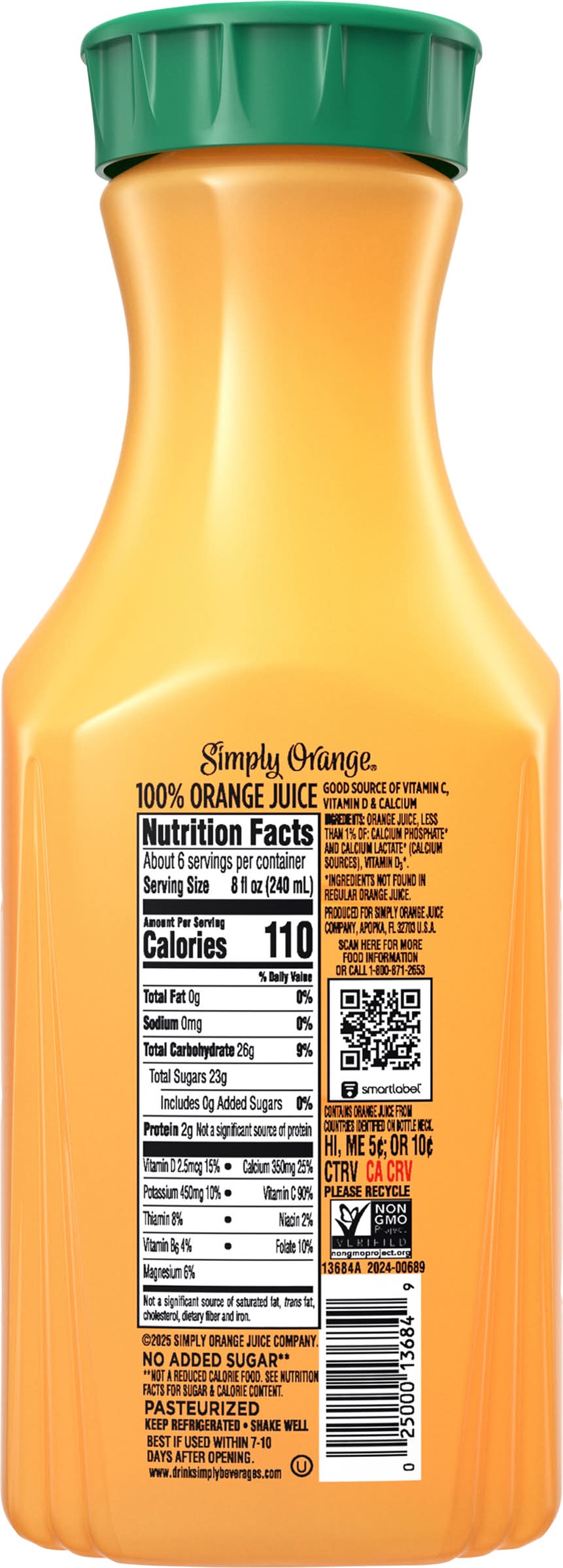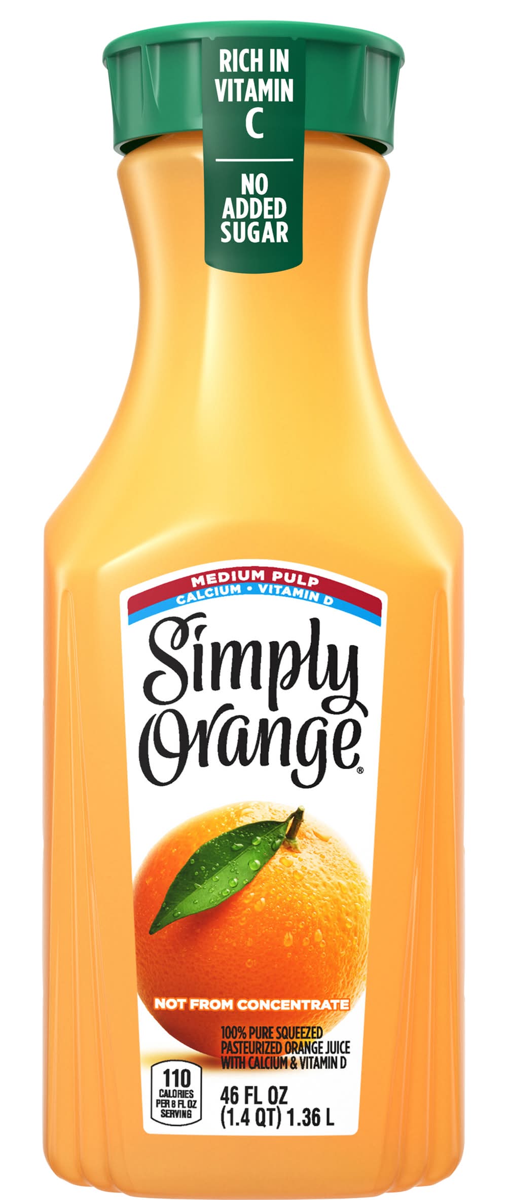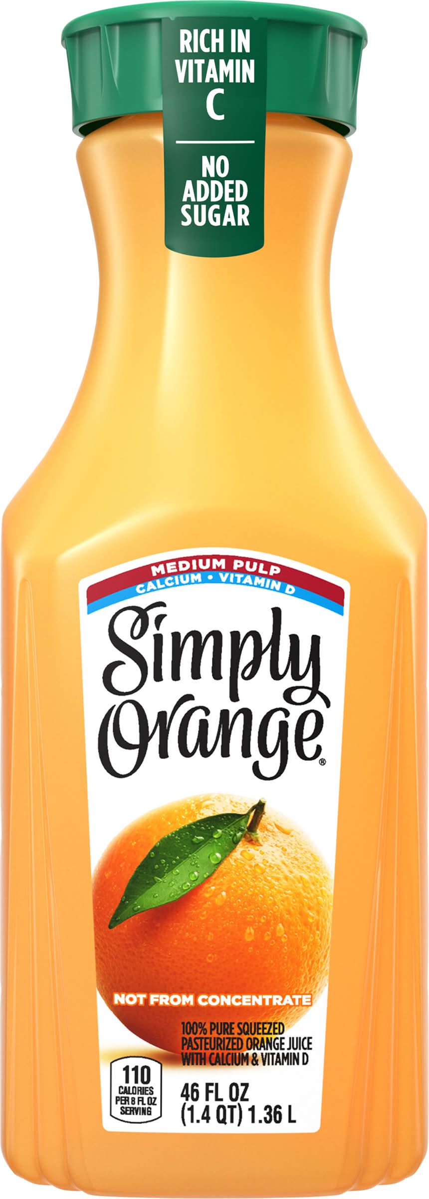 For Simply Orange Medium Pulp with Calcium & Vitamin D, we carefully select real, ripe oranges and turn them into a deliciously simple medium-pulp orange juice. Not from concentrate with a deliciously fresh-squeezed taste. • Flavor: Orange • Packaging: Reusable