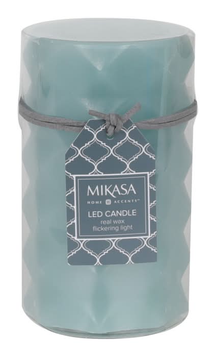 Safely add a soft glow and warm ambience to your home with this Blue Embossed LED Wax Pillar Candle from Mikasa. It is made of real wax with a flickering LED flame, offering the beauty and elegance of a traditional candle without the smoke or wax drippings. This blue candle features a unique, embossed design that brings a modern look to your decor, making it great by adding a touch of style to table settings, enhancing party venues, and more. Operates on 2 AA batteries, not included. Measures 3-inch L x 3-inch W x 5-inch H.