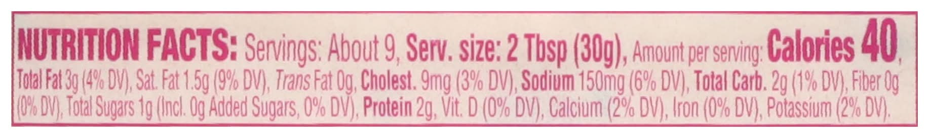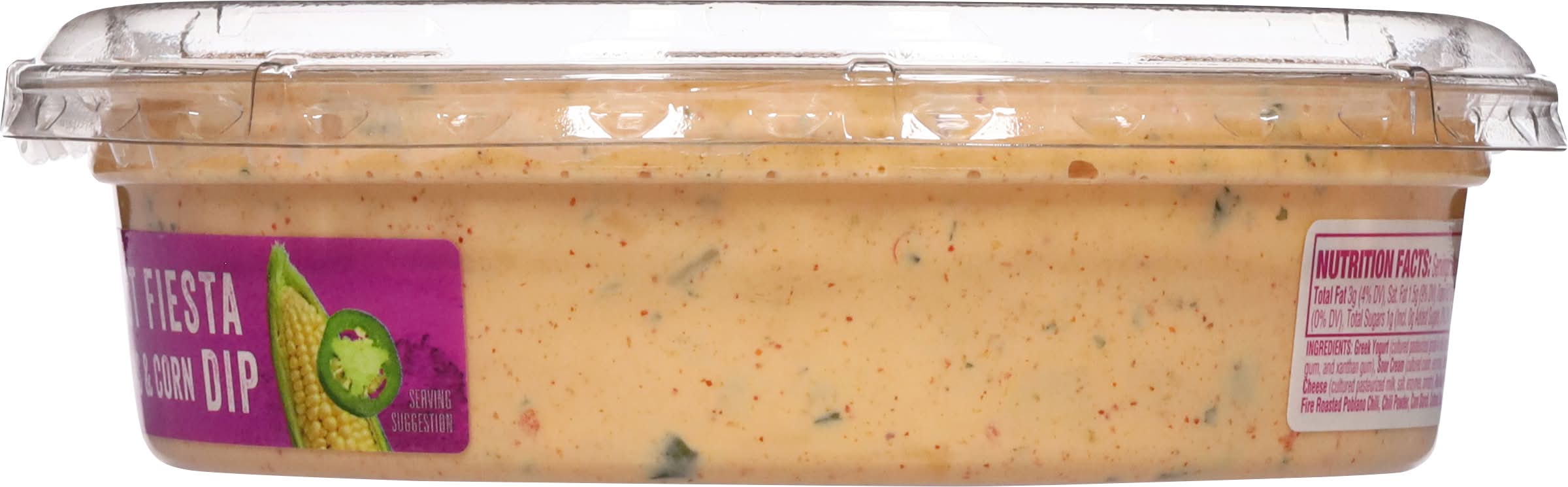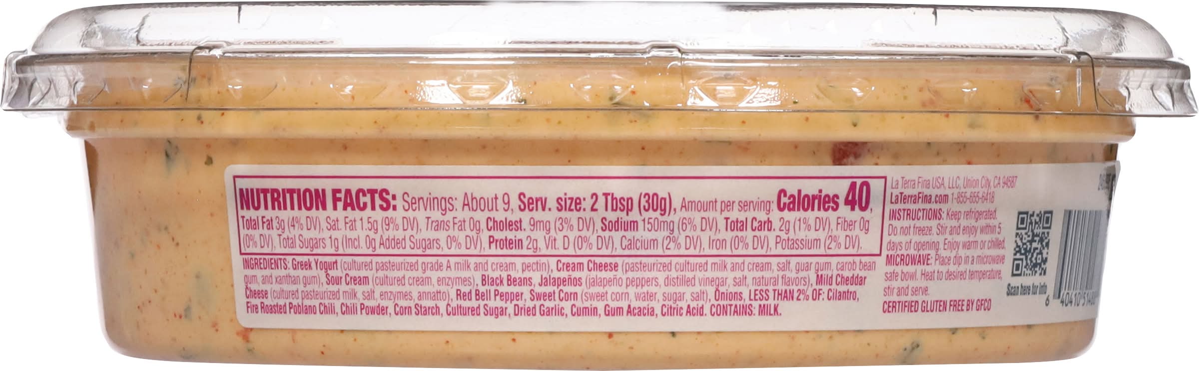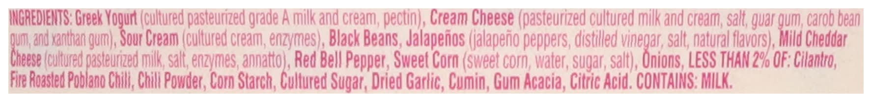 Ingredients: Greek Yogurt (Cultured Pasteurized Grade A Milk and Cream, Pectin), Cream Cheese (Pasteurized Cultured Milk and Cream, Salt, Guar Gum, Carob Bean Gum, and Xanthan Gum), Sour Cream (Cultured Cream, Enzymes), Black Beans, Jalapenos (Jalapeno Peppers, Distilled Vinegar, Salt, Natural Flavors), Mild Cheddar Cheese (Cultured Pasteurized Milk, Salt, Enzymes, Annatto), Red Bell Pepper, Sweet Corn (Sweet Corn, Water, Sugar, Salt), Onions, Less than 2% of: Cilantro, Fire Roasted Poblano Chili, Chili Powder, Corn Starch, Cultured Sugar, Dried Garlic, Cumin, Gum Acacia, Citric Acid Contains: Milk