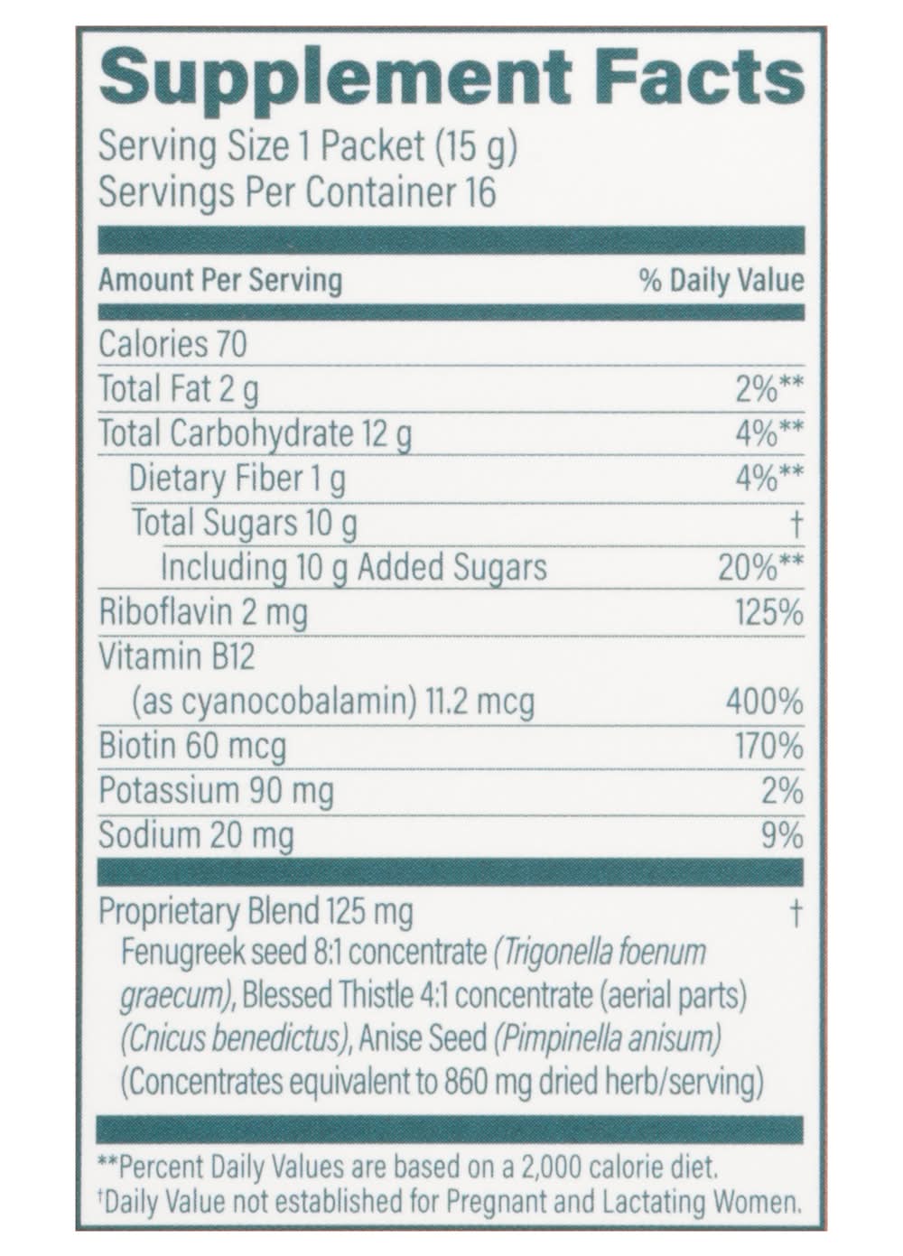Ingredients: Proprietary Blend: Fenugreek Seed 8:1 Concentrate (Trigonella Foenum Graecum), Blessed Thistle 4:1 Concentrate (Aerial Parts) (Cnicus Benedictus), Anise Seed (Pimpinella Anisum) (Concentrates Equivalent to 860 mg Dried Herb/Serving). Other Ingredients: Cane Sugar, Medium Chain Triglycerides, Cocoa (Processed with Alkali), Non-Fat Dry Milk, Dextrose, Disodium Phosphatase, Silicone Dioxide, Maltodextrin, Natural Flavor, Dibasic Calcium Phosphate, Steviol Glycosides (Extracted & Purified from Natural Stevia Leaf), Guar Gum, Salt, Propylene Glycol, Citric Acid, Dextrin, Rice Hulls Contains: Milk, Milk, Soybeans, Eggs, Tree Nuts, Wheat