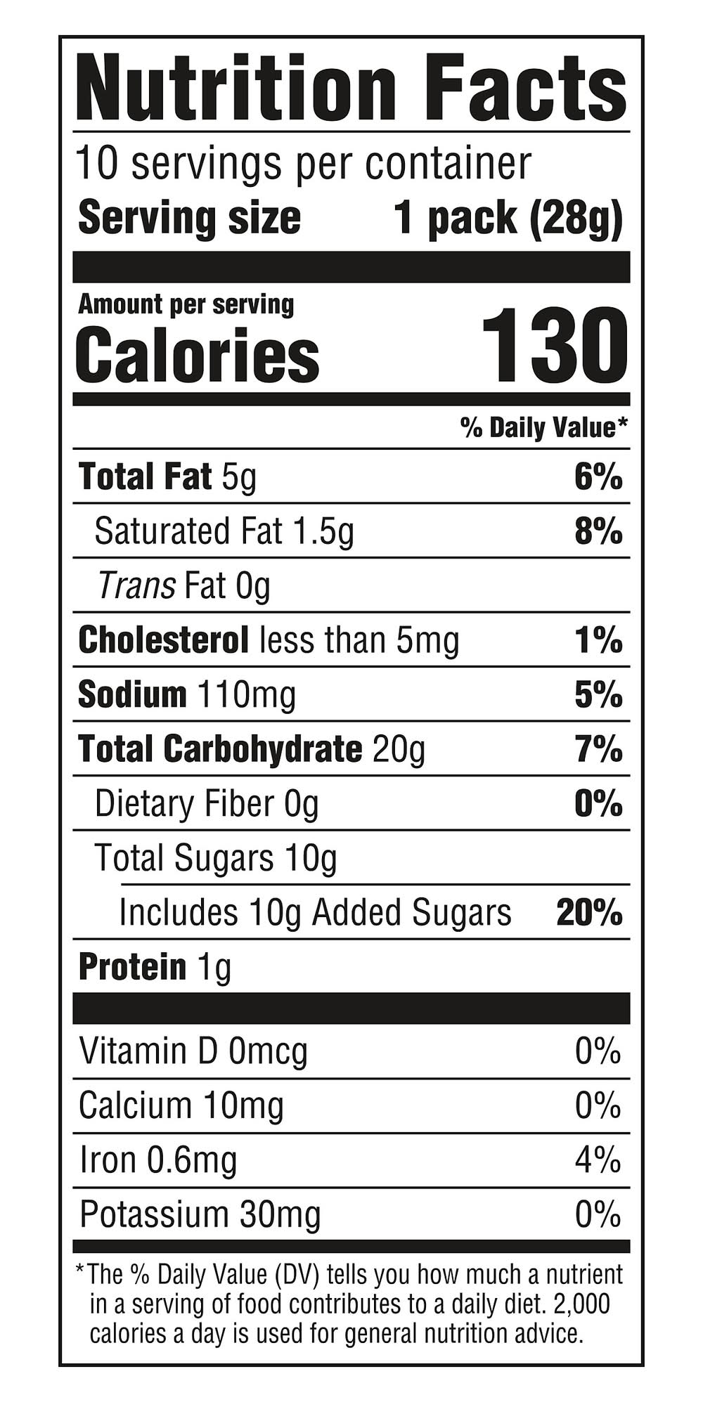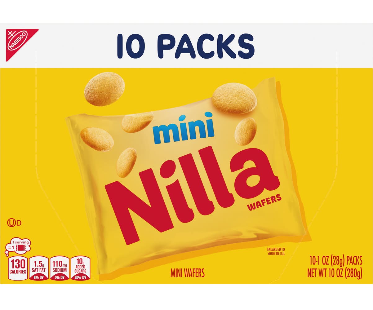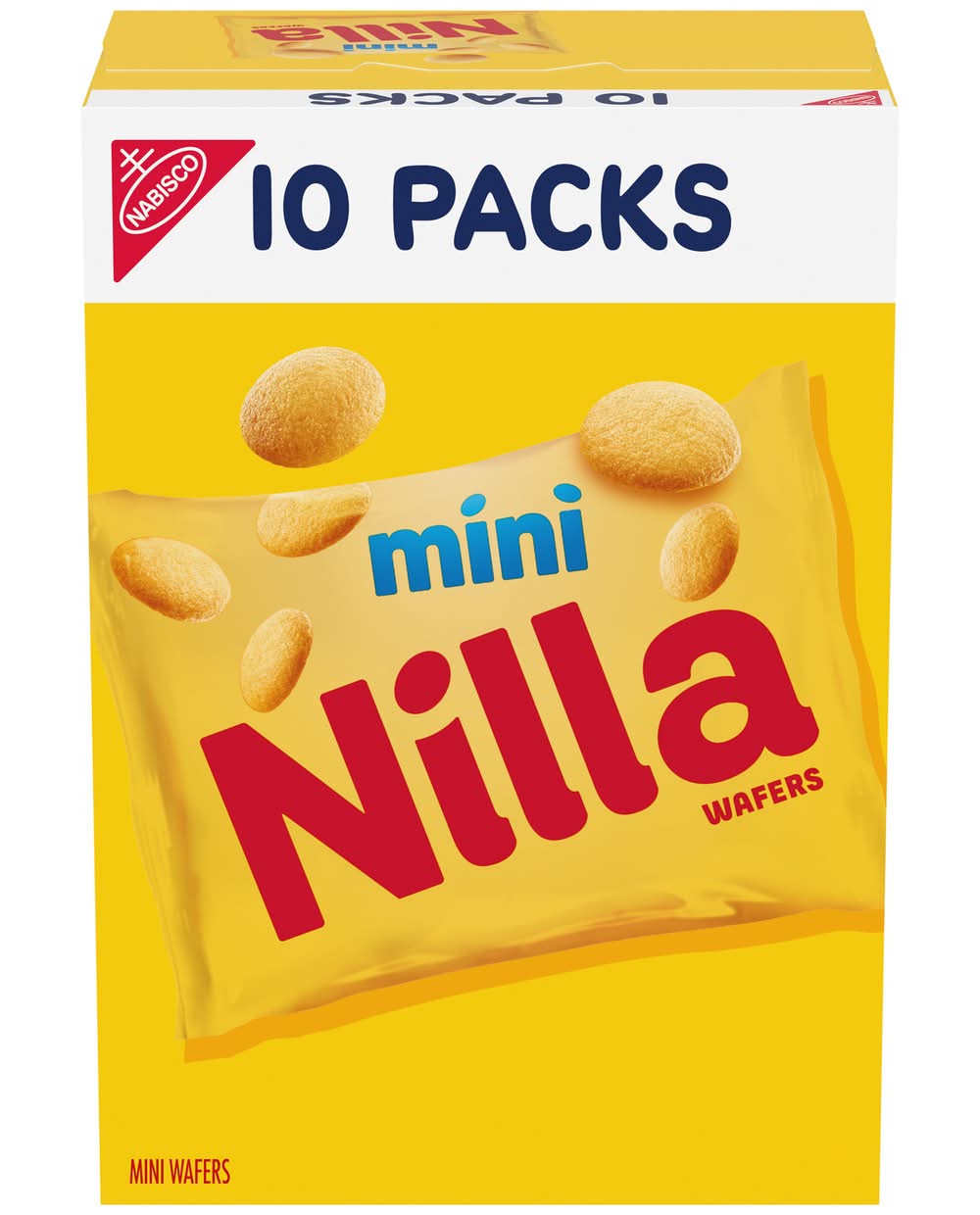 With NILLA Wafers Mini Wafer Cookies, the dessert possibilities are endless. These mini cookies are sweet, crispy, and artificially flavored vanilla wafers like their regular-sized counterparts, but their smaller size makes them convenient for grabbing and snacking. Mini NILLA Wafers are great for topping banana pudding, cakes, and cupcakes, or creating mini ice cream sandwiches or vanilla pudding cups. These vanilla-flavored cookies are deliciously sweet snacks. Offered in individual snack packs ideal for school lunch snacks and office snacks, they are wonderful for enjoying on the go or in the comfort of your own home. Whether you're in the mood for something sweet to pair with your afternoon tea or coffee, or preparing a homemade dessert for a family get-together, NILLA Wafers are always a delicious option. Each box contains 10 conveniently portable 1-ounce single-serve snack packs of NILLA Wafers Mini Cookies. • Flavor: Vanilla • Pack size: 10