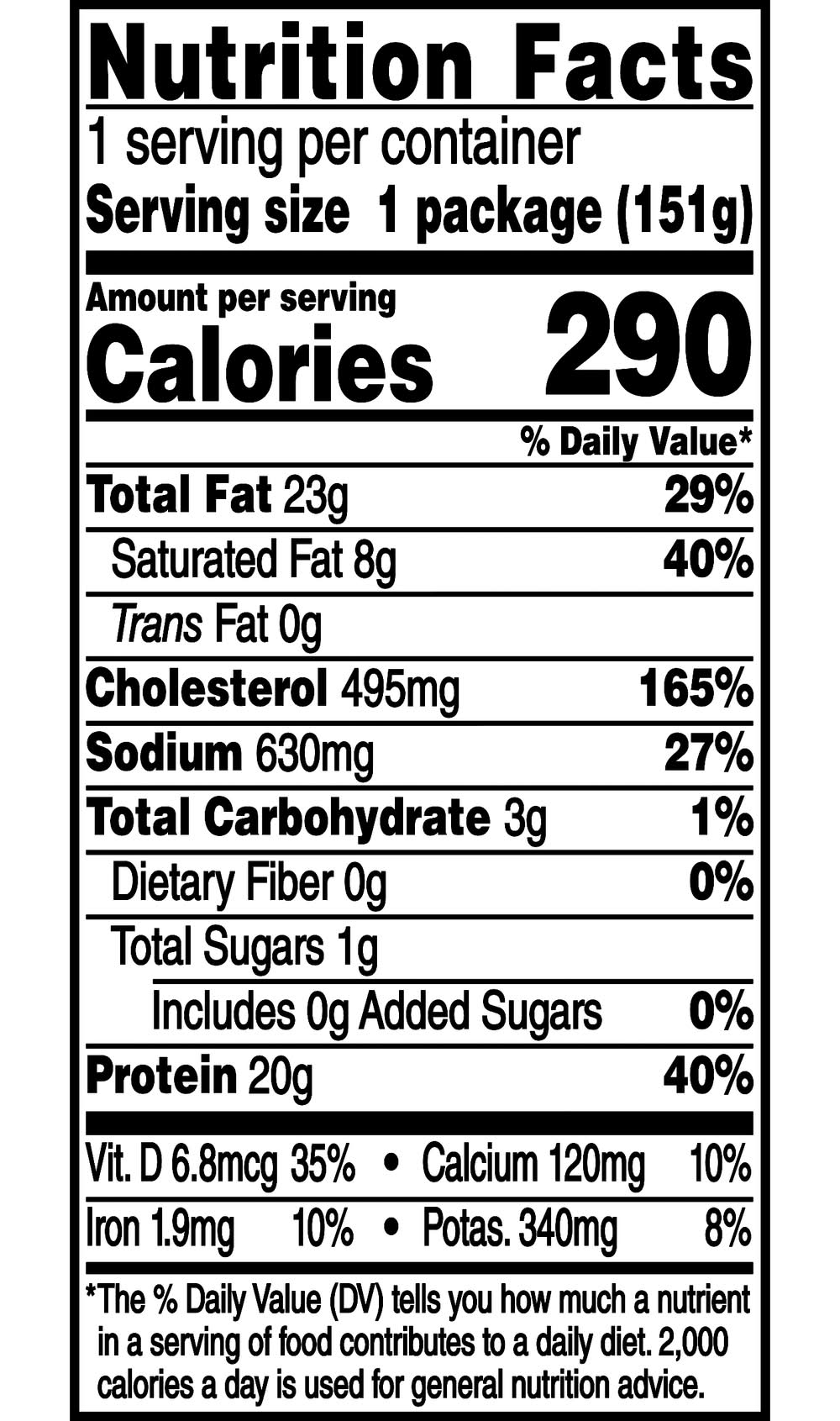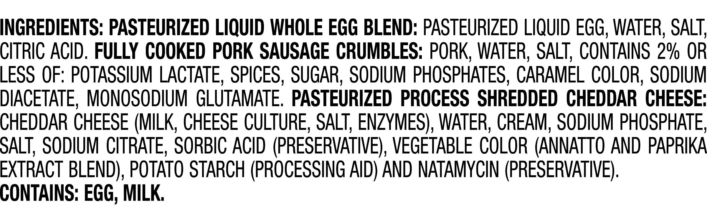Ingredients: Pasteurized Liquid Whole Egg Blend: pasteurized liquid egg, water, salt, citric acid. Fully Cooked Pork Sausage Crumbles: Pork, Water, Salt, Contains 2% Or Less Of: Potassium Lactate, Spices, Sugar, Sodium Phosphates, Caramel Color, Sodium Diacetate, Monosodium Glutamate. Pasteurized Process Shredded Cheddar Cheese: Cheddar Cheese (Milk, Cheese Culture, Salt, Enzymes), Water, Cream, Sodium Phosphate, Salt, Sodium Citrate, Sorbic Acid (Preservative), Vegetable Color (Annatto And Paprika Extract Blend), Potato Starch (Processing Aid) And Natamycin (Preservative).